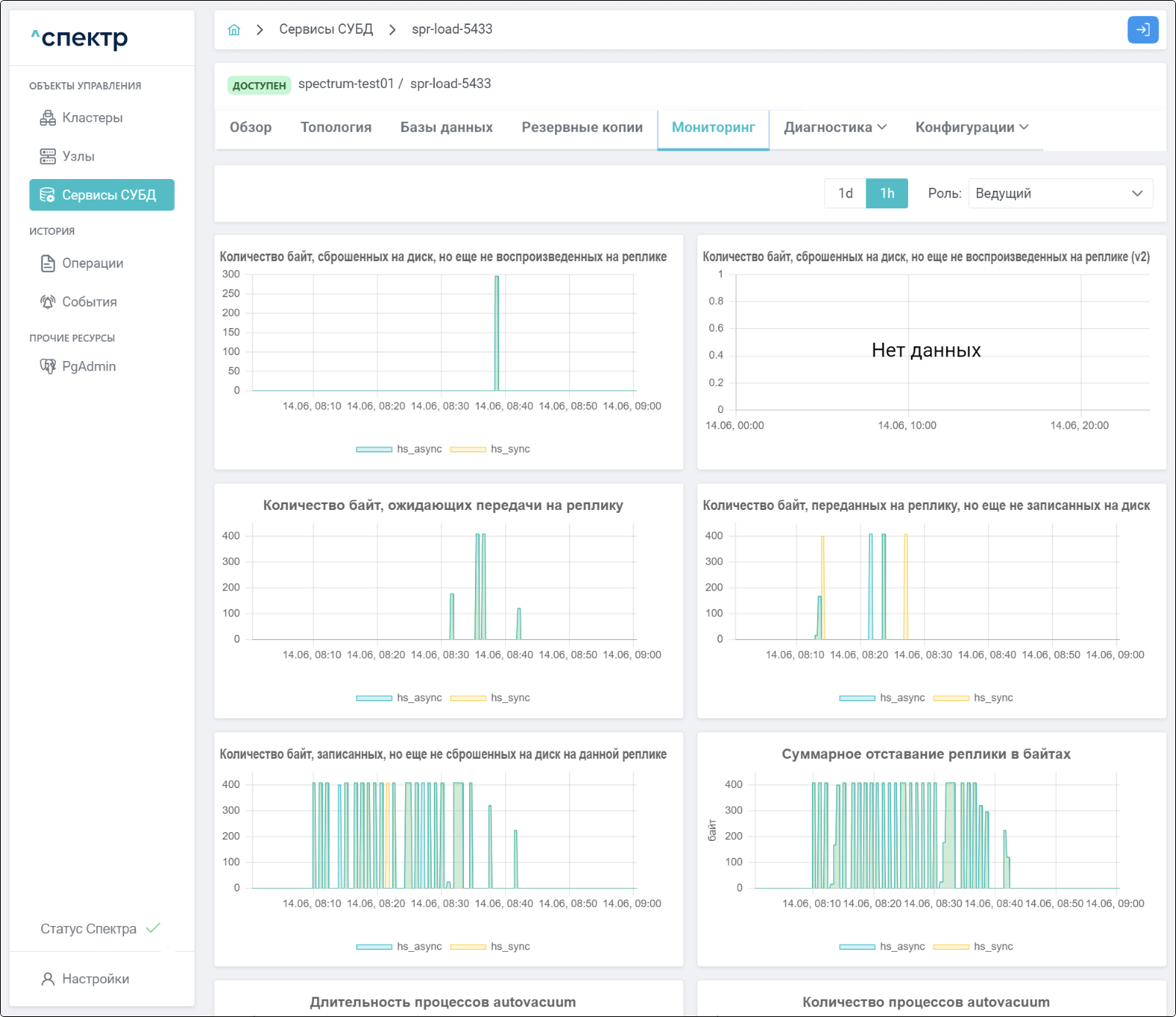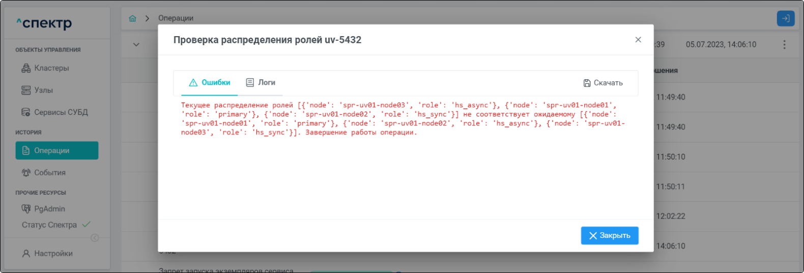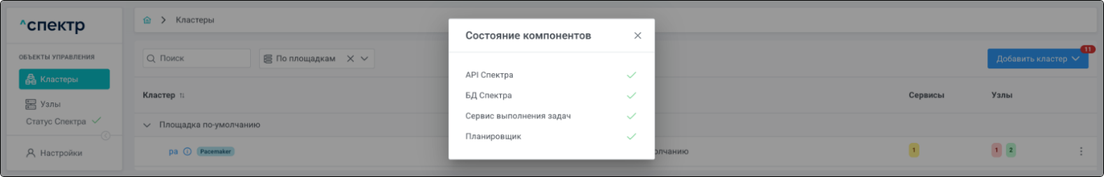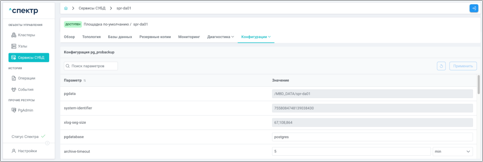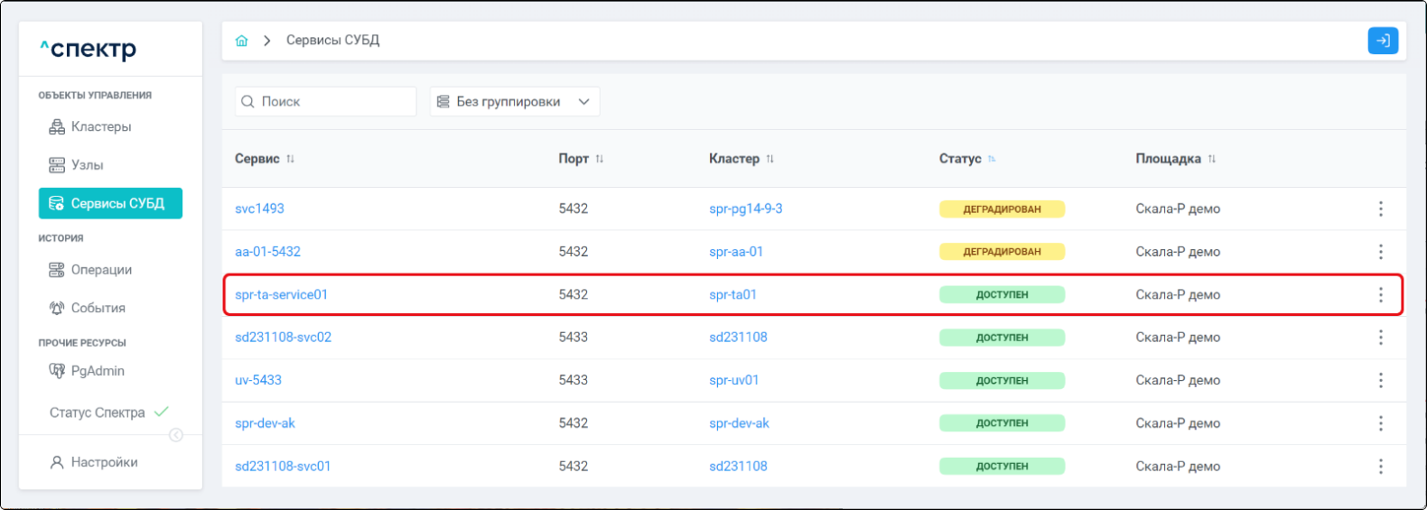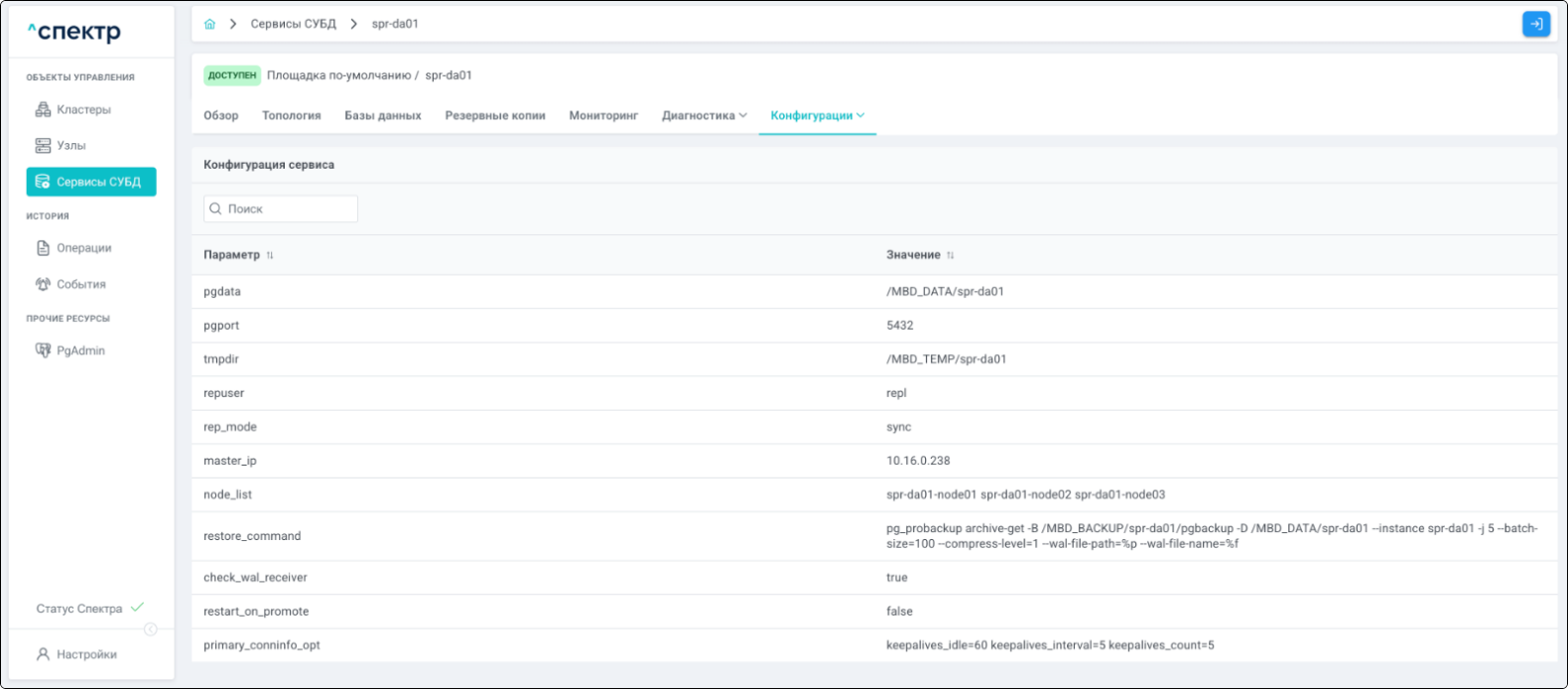 | Агент Спектра | Специализированное программное обеспечение, которое устанавливается на узлы кластера и используется в работе ПО «Скала^р Спектр» для выполнения следующих задач: получение актуальной конфигурации кластера; получение и обновление конфигураций СУБД и программы управляющей пулом соединений PgBouncer; выполнение операций с кластером, сервисами, узлами; предоставление метрик о состоянии кластера, узлов, сервисов СУБД, баз данных для системы мониторинга. |
