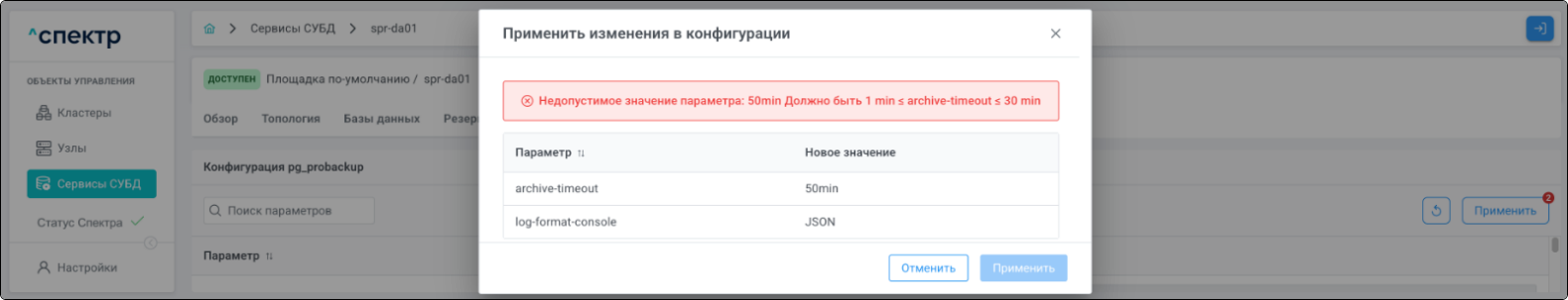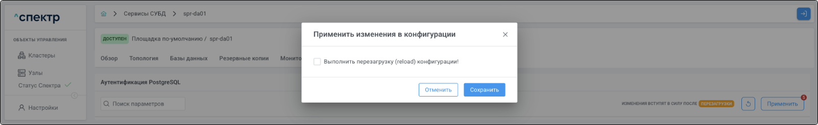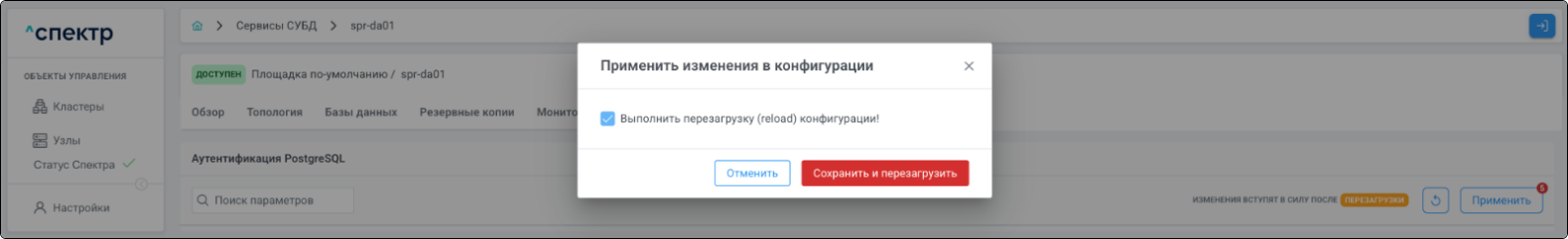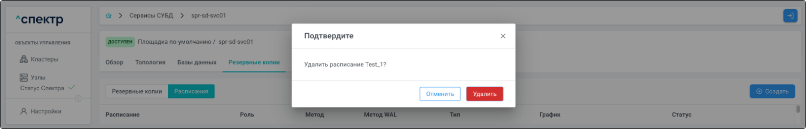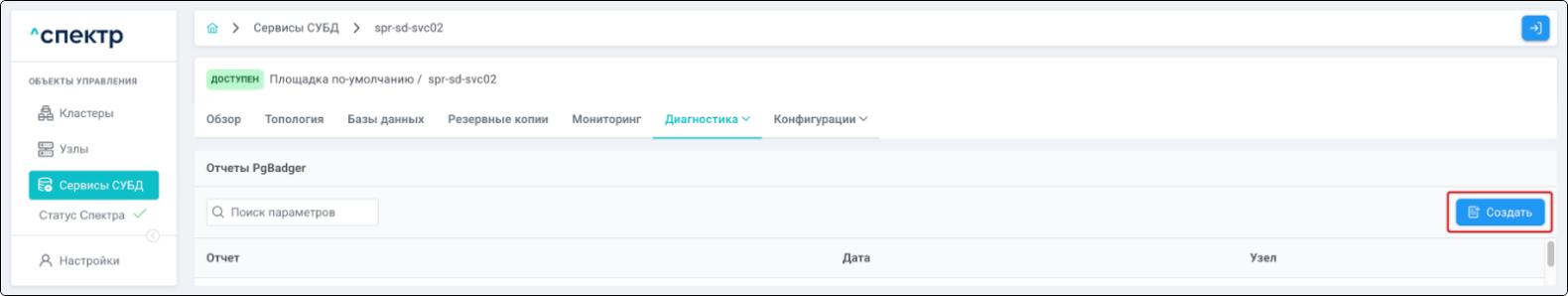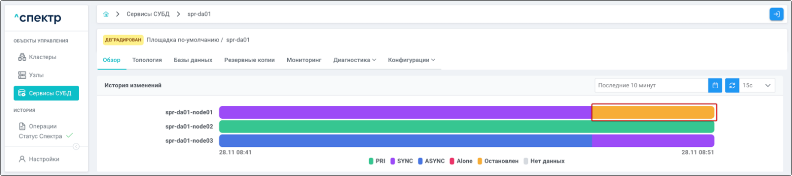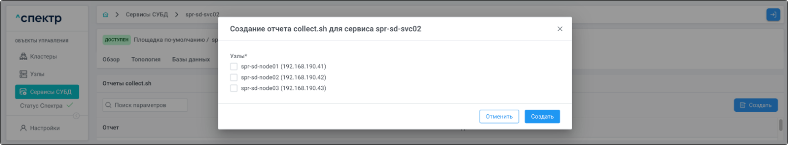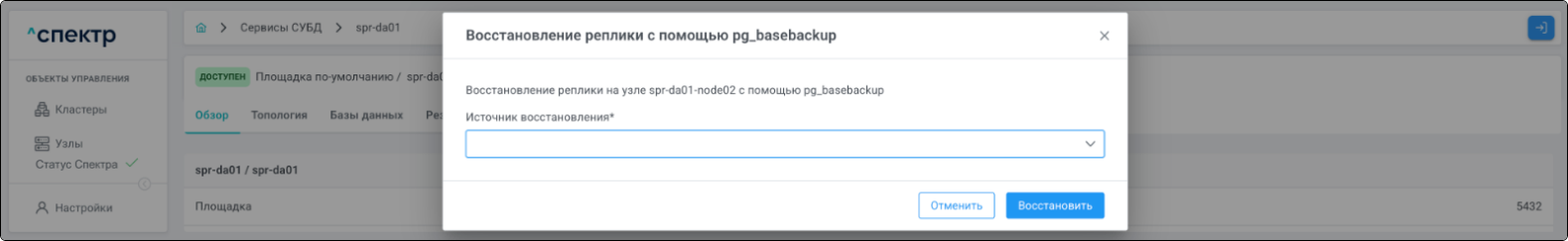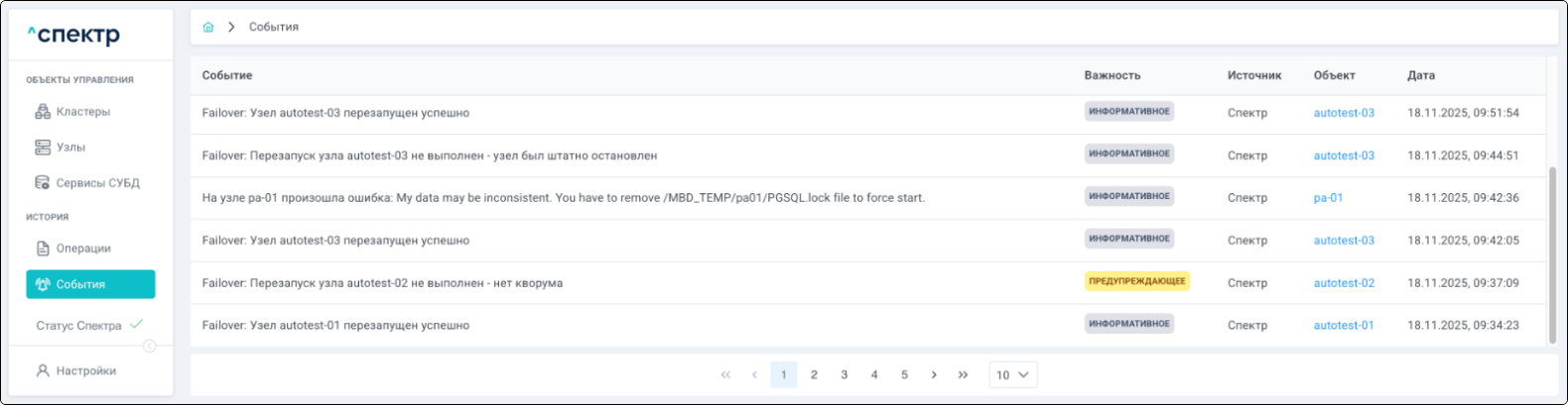 | Агент Спектра | Специализированное программное обеспечение, которое устанавливается на узлы кластера и используется в работе ПО «Скала^р Спектр» для выполнения следующих задач: получение актуальной конфигурации кластера; получение и обновление конфигураций СУБД и программы управляющей пулом соединений PgBouncer; выполнение операций с кластером, сервисами, узлами; предоставление метрик о состоянии кластера, узлов, сервисов СУБД, баз данных для системы мониторинга. |
