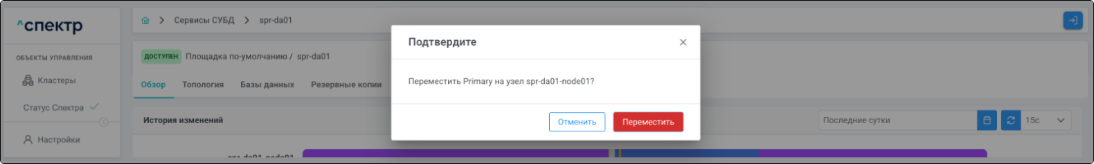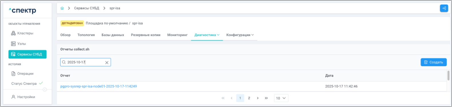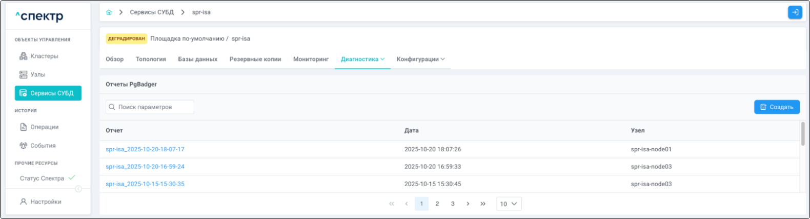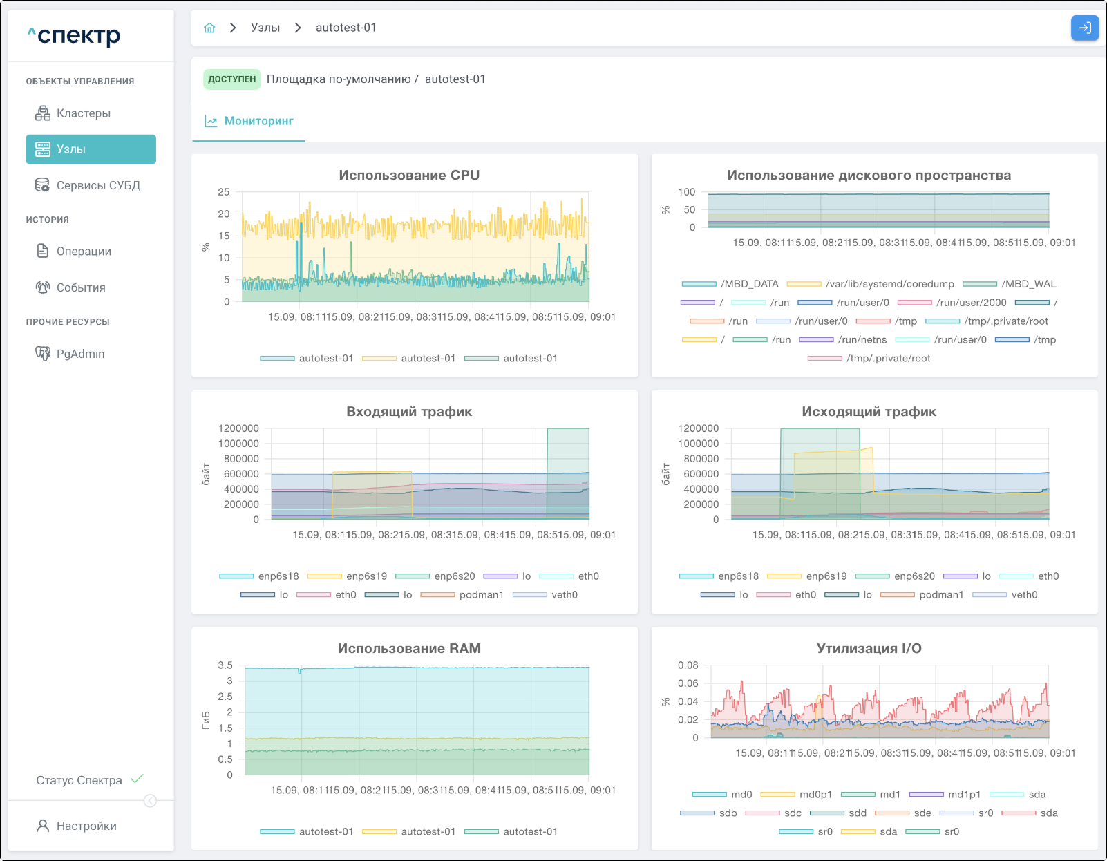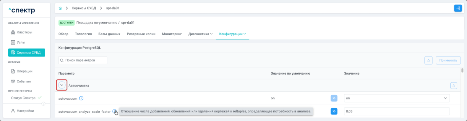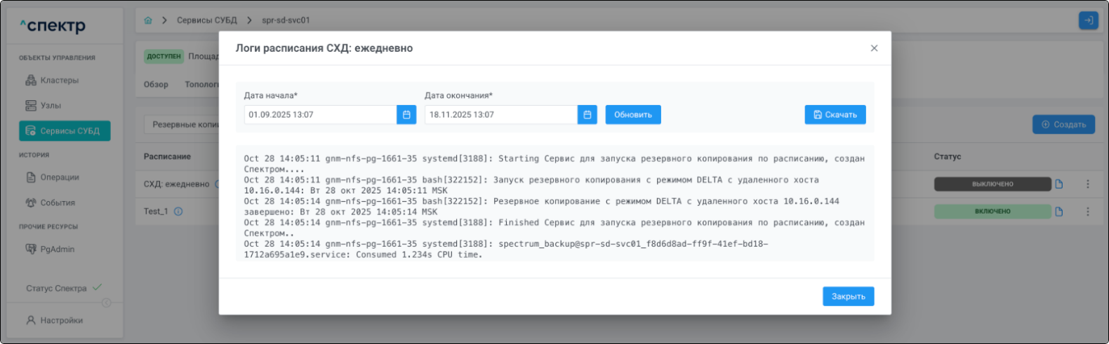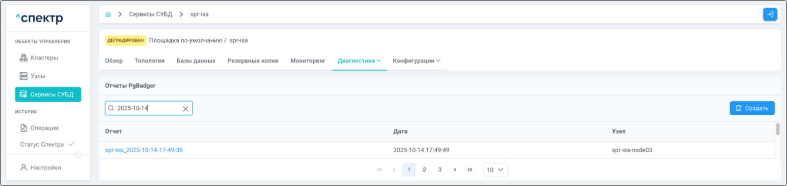 | Агент Спектра | Специализированное программное обеспечение, которое устанавливается на узлы кластера и используется в работе ПО «Скала^р Спектр» для выполнения следующих задач: получение актуальной конфигурации кластера; получение и обновление конфигураций СУБД и программы управляющей пулом соединений PgBouncer; выполнение операций с кластером, сервисами, узлами; предоставление метрик о состоянии кластера, узлов, сервисов СУБД, баз данных для системы мониторинга. |