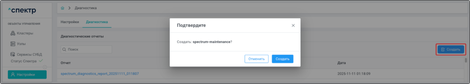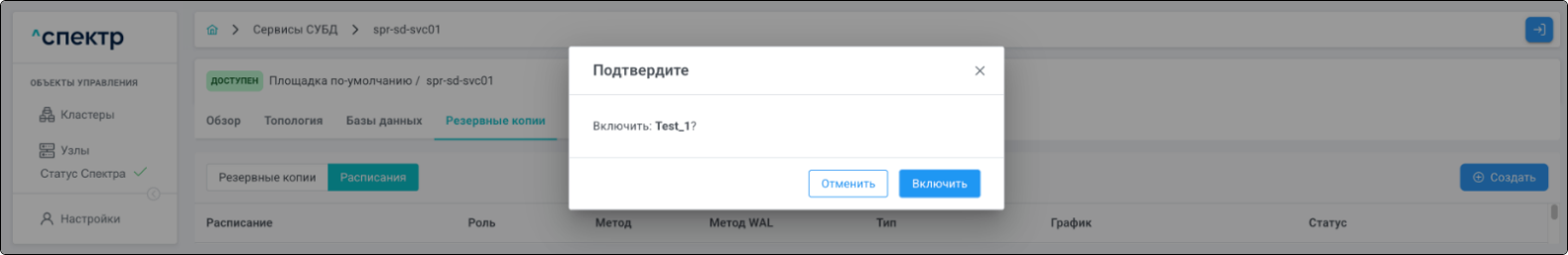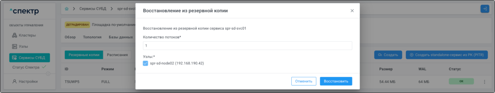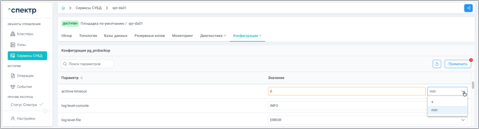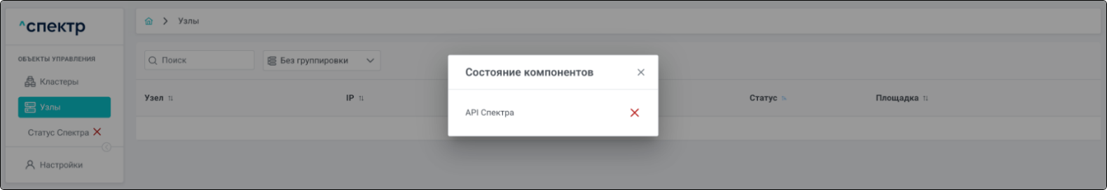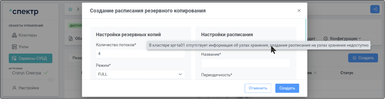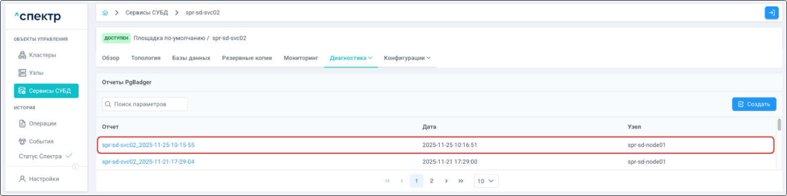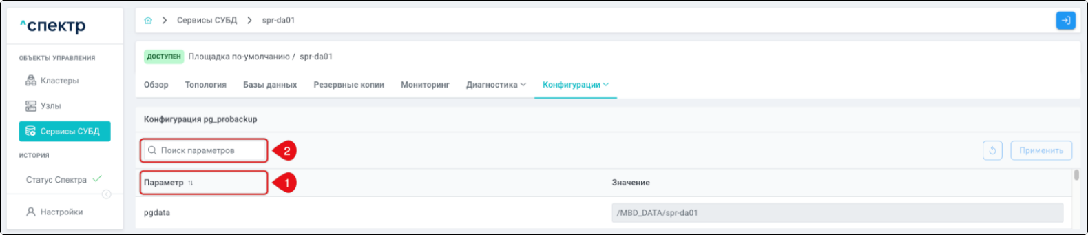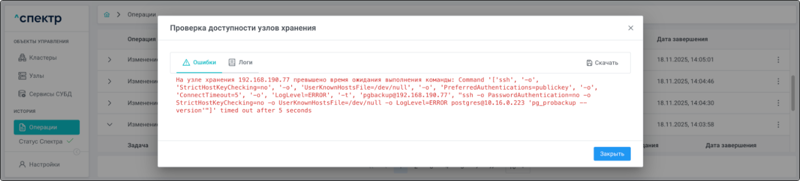 | Агент Спектра | Специализированное программное обеспечение, которое устанавливается на узлы кластера и используется в работе ПО «Скала^р Спектр» для выполнения следующих задач: получение актуальной конфигурации кластера; получение и обновление конфигураций СУБД и программы управляющей пулом соединений PgBouncer; выполнение операций с кластером, сервисами, узлами; предоставление метрик о состоянии кластера, узлов, сервисов СУБД, баз данных для системы мониторинга. |