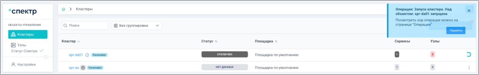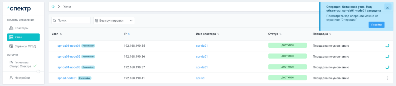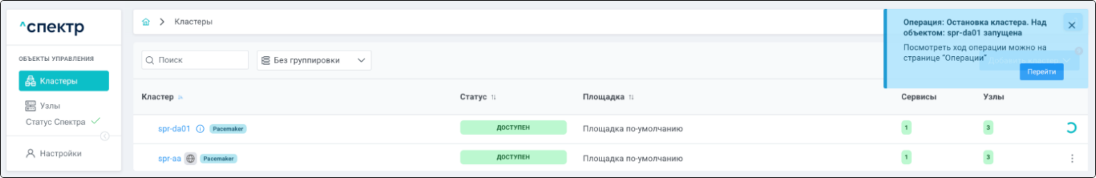 В процессе выполнения операции для кластера, в котором выполняется удаление pgBouncer, и всех объектов этого кластера вместо элементов управления вызова меню действий отображаются вращающиеся спиннеры.