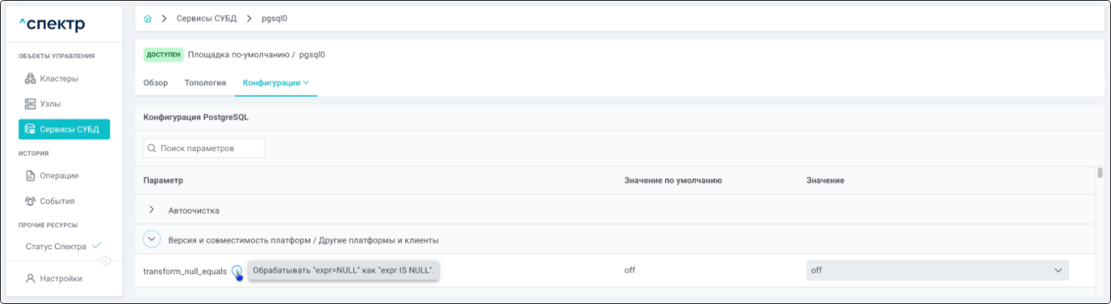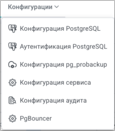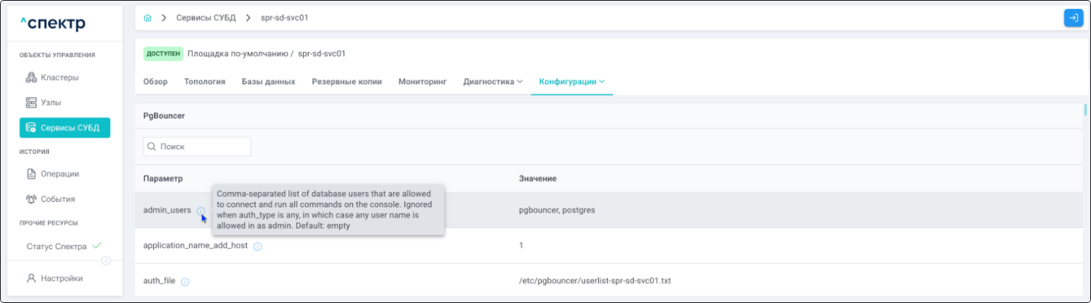 при переходе к пункту “PgBouncer” вкладки “Конфигурации” для сервиса, в который добавлен pgBouncer, отображаются его параметры: