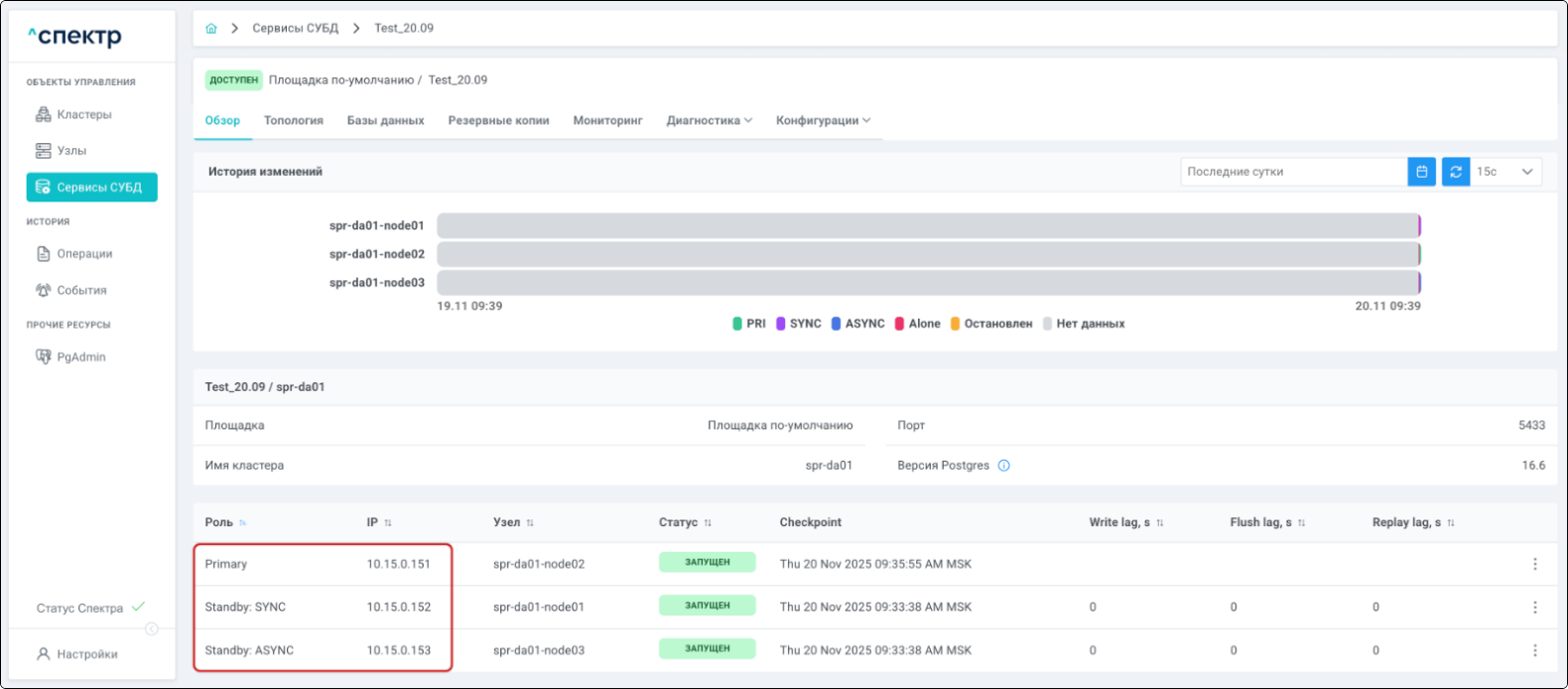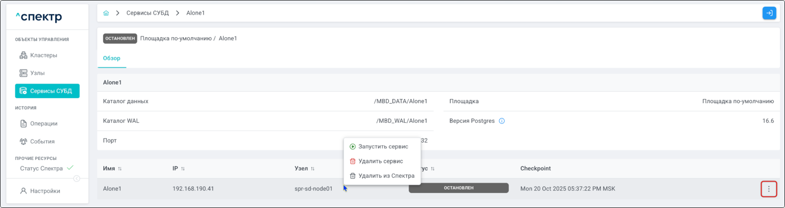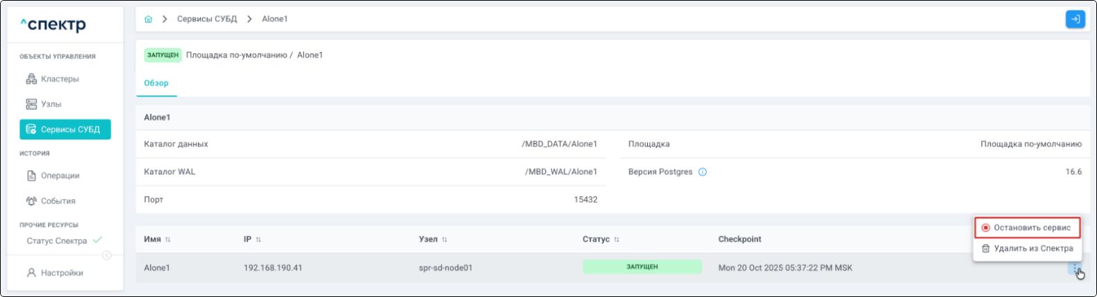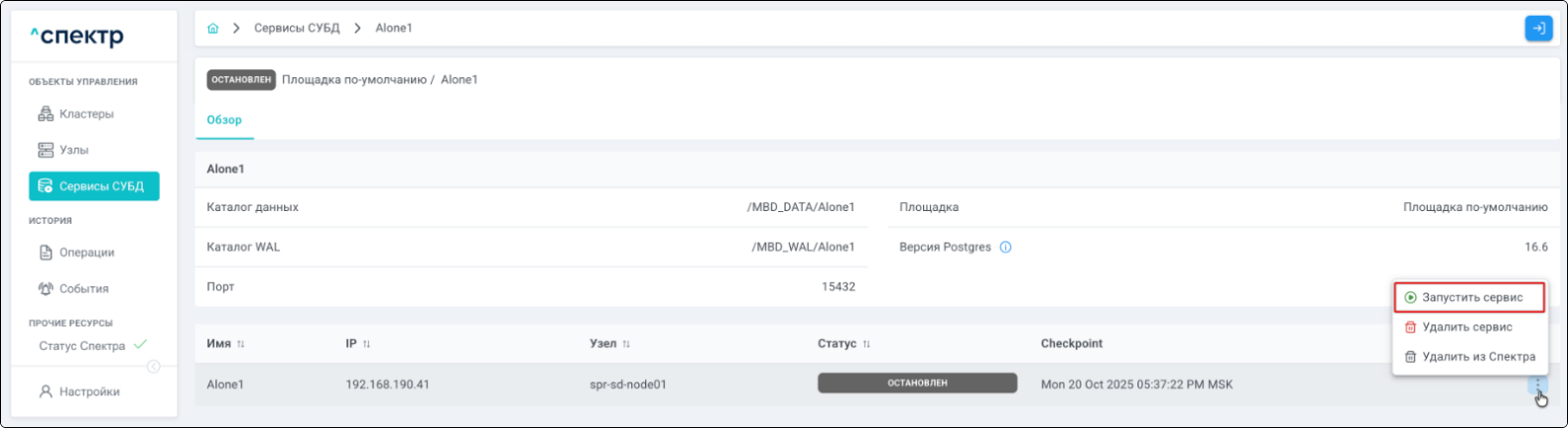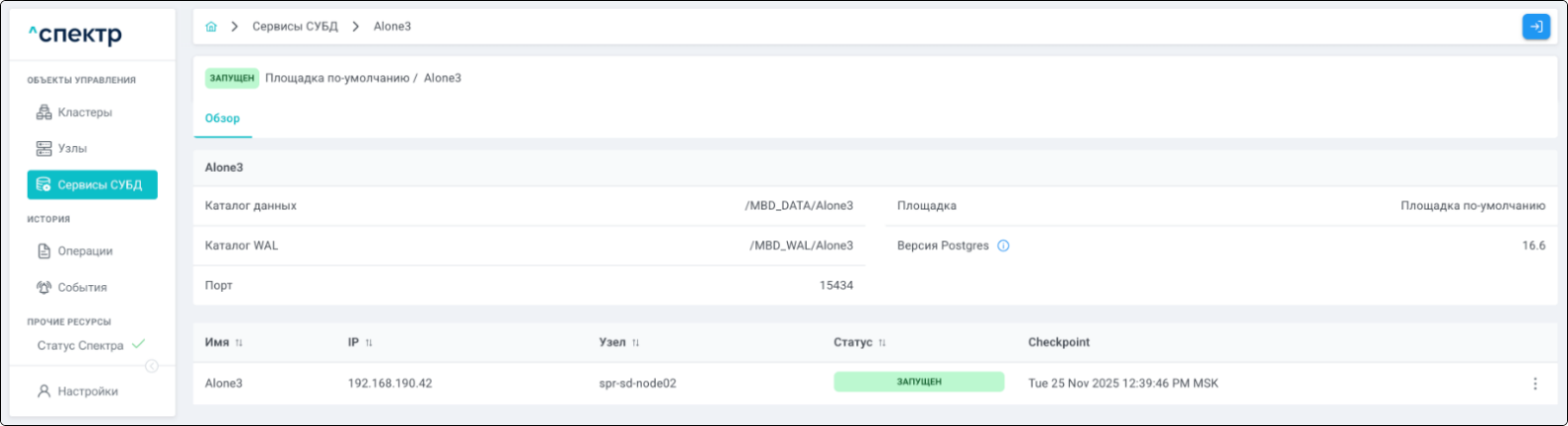 | Standalone-сервис | Одиночный экземпляр PostgreSQL, который не находится под управлением кластерного ПО, но запущен на одном из узлов МБД.П. |