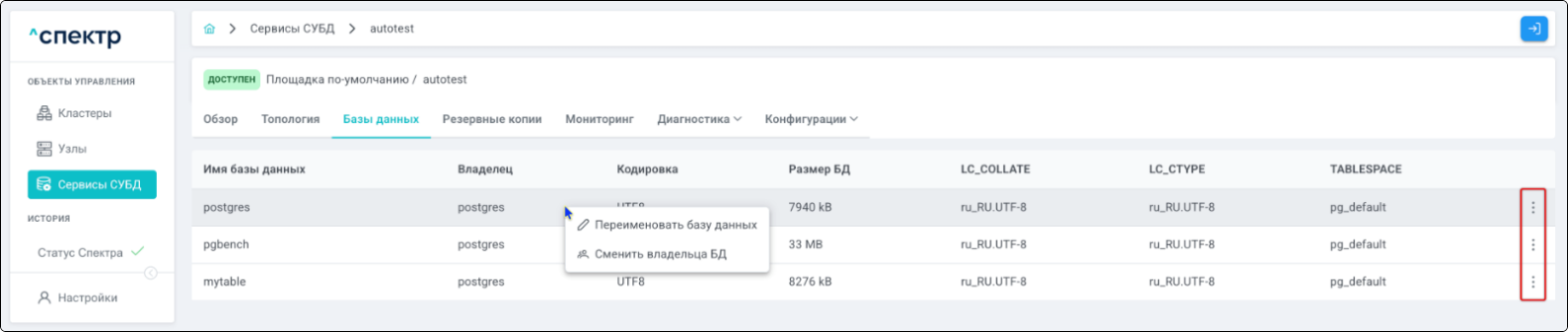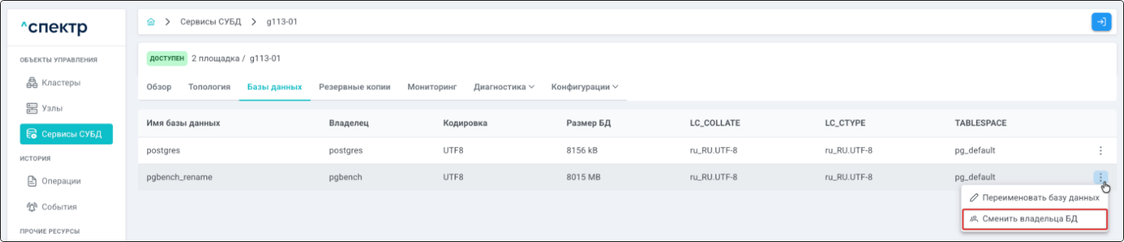 Нажать на соответствующий выбранной базе данных элемент управления ⋮ вызова меню со списком возможных операций и выбрать пункт “Сменить владельца базы данных”: