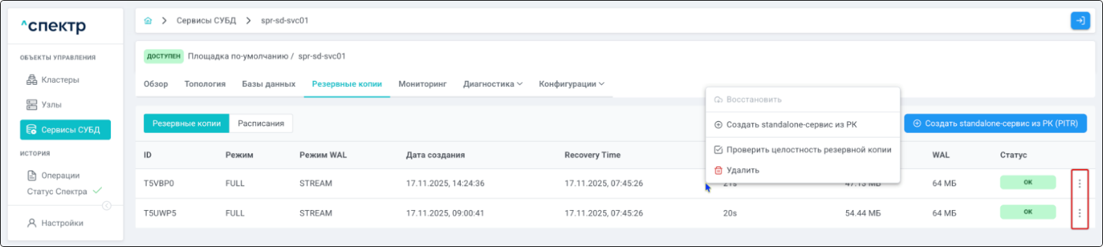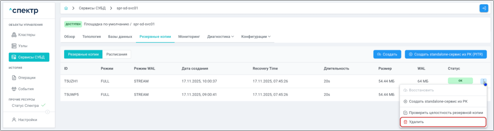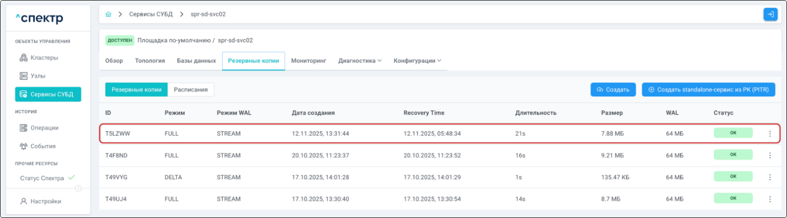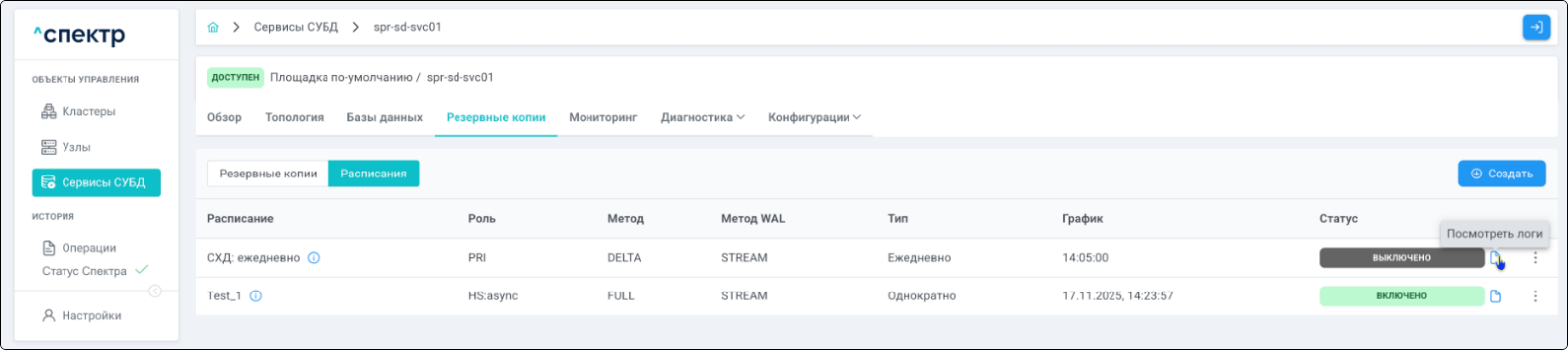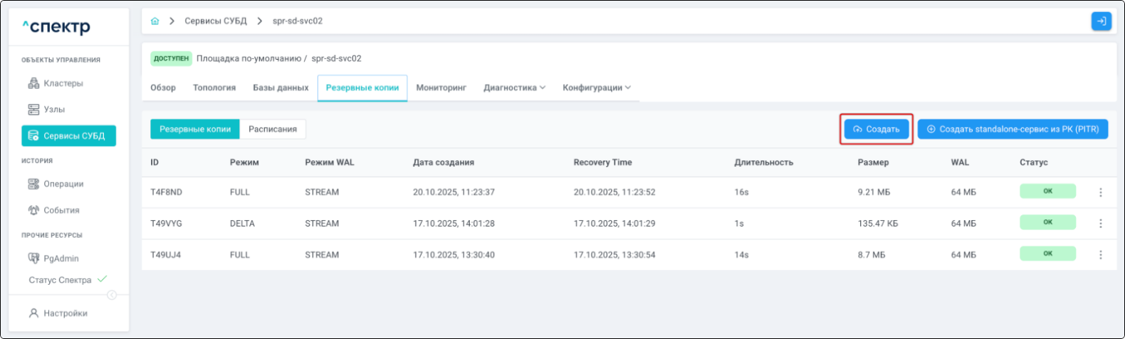 | Резервная копия | Бинарная копия файлов экземпляра СУБД (экземпляра сервиса), включающая в себя пользовательские данные, файлы конфигураций и журналы предзаписи. |