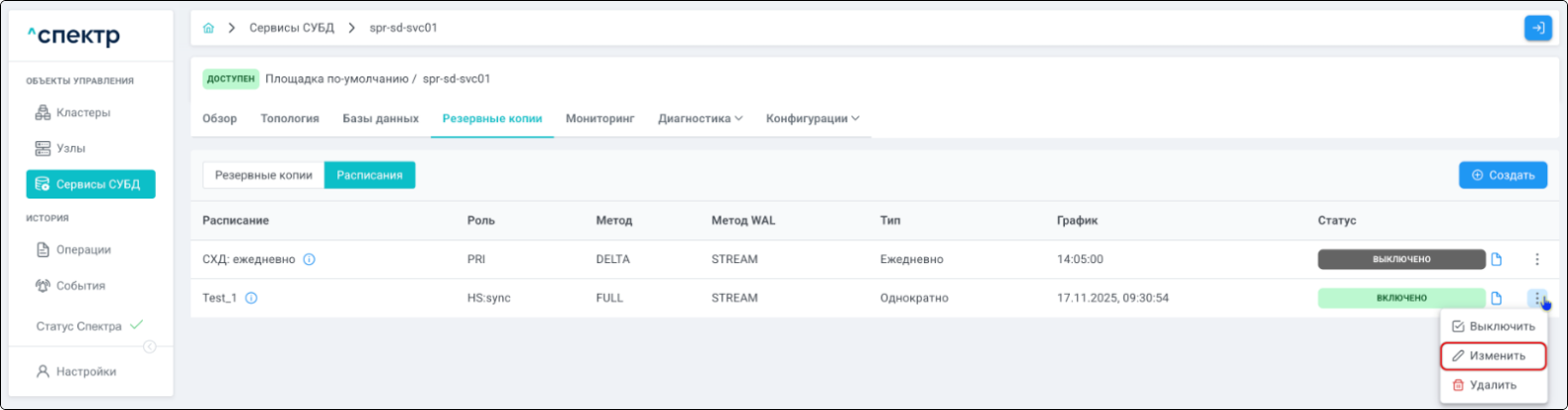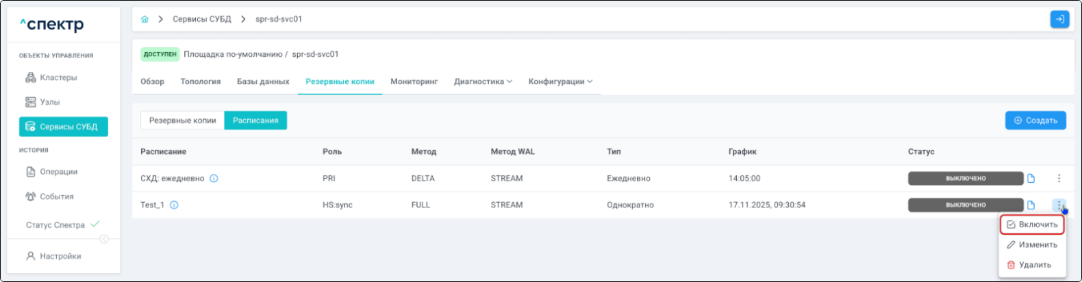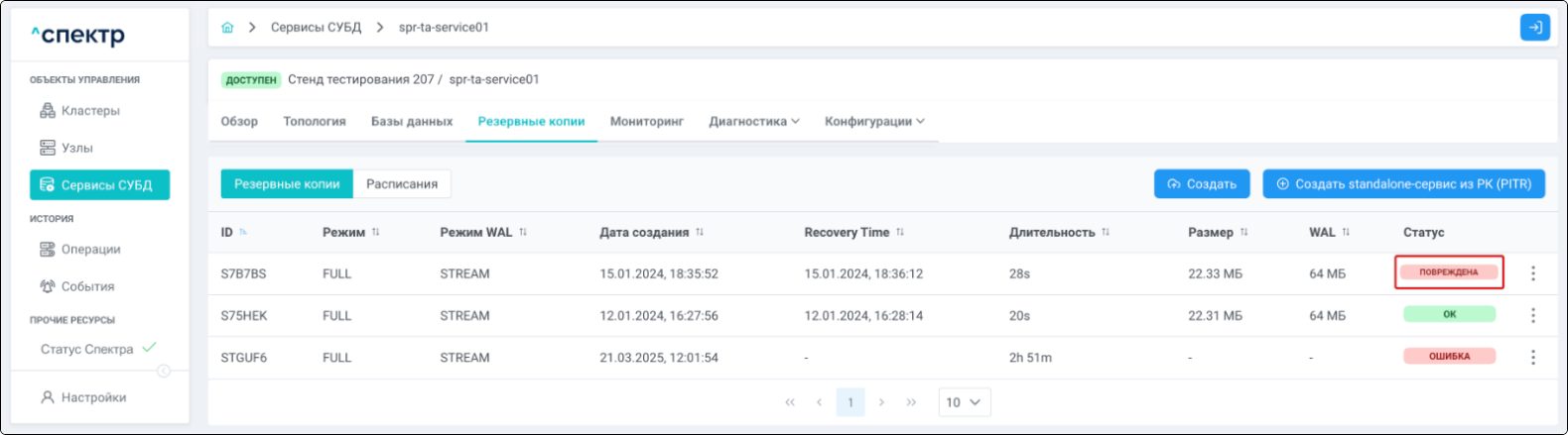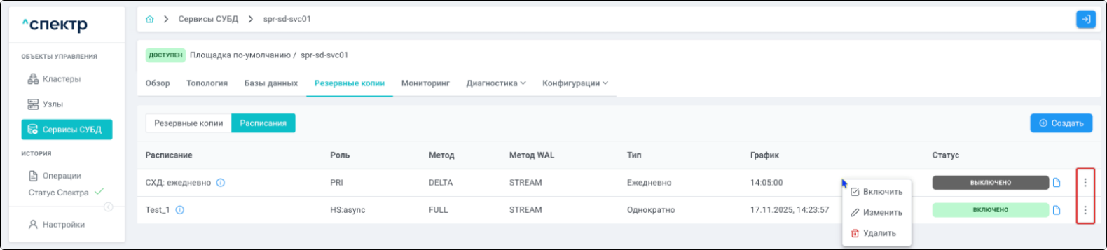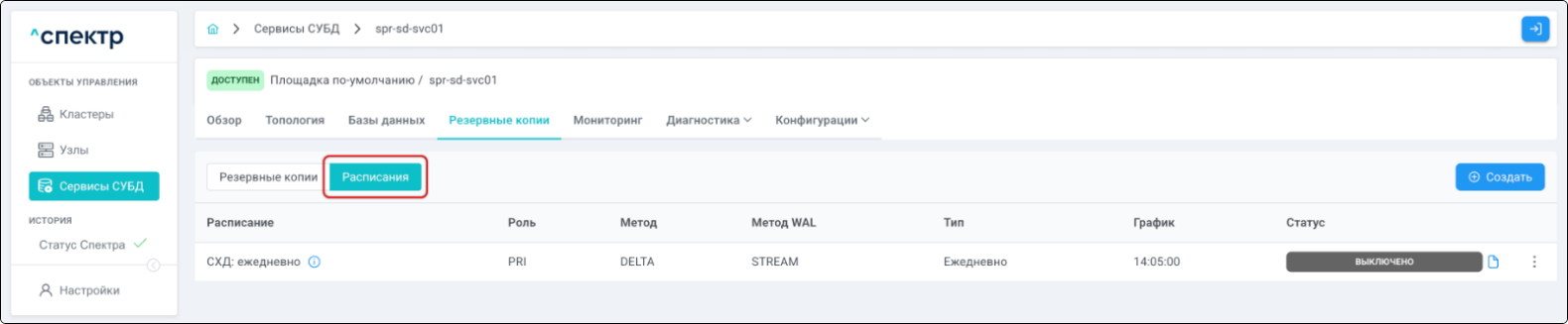 | Резервная копия | Бинарная копия файлов экземпляра СУБД (экземпляра сервиса), включающая в себя пользовательские данные, файлы конфигураций и журналы предзаписи. |