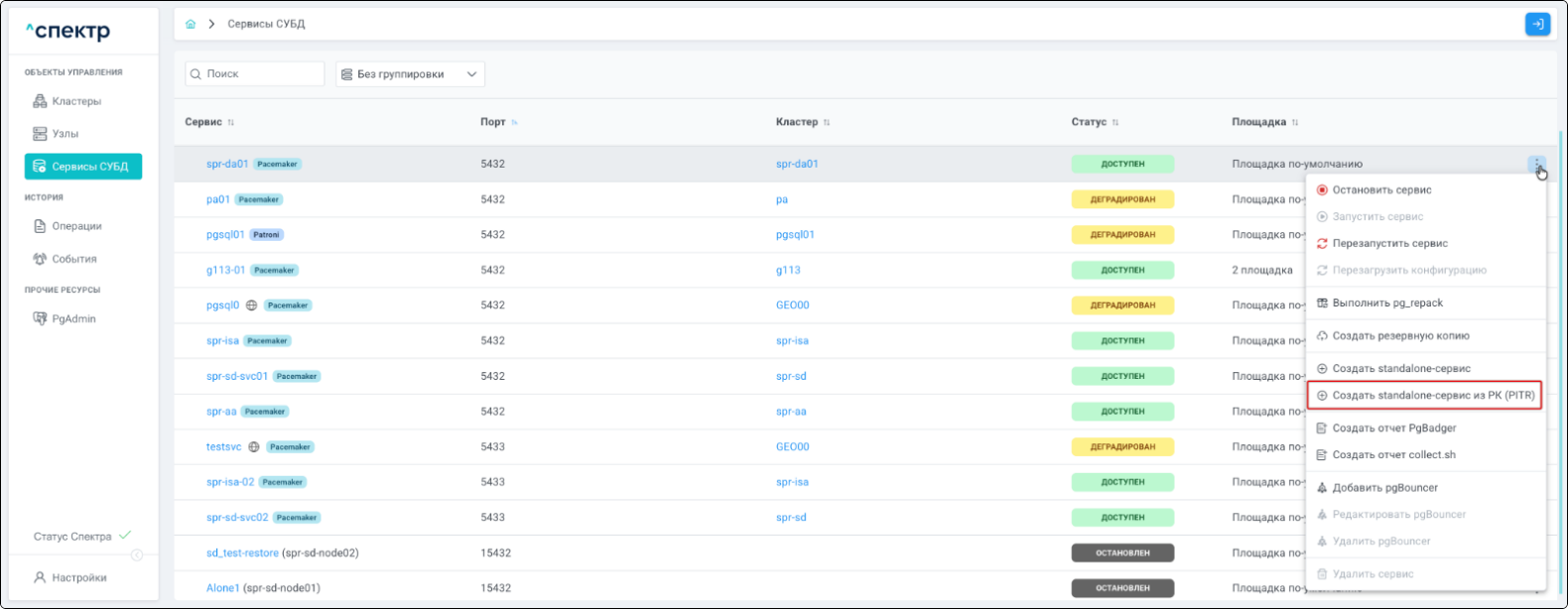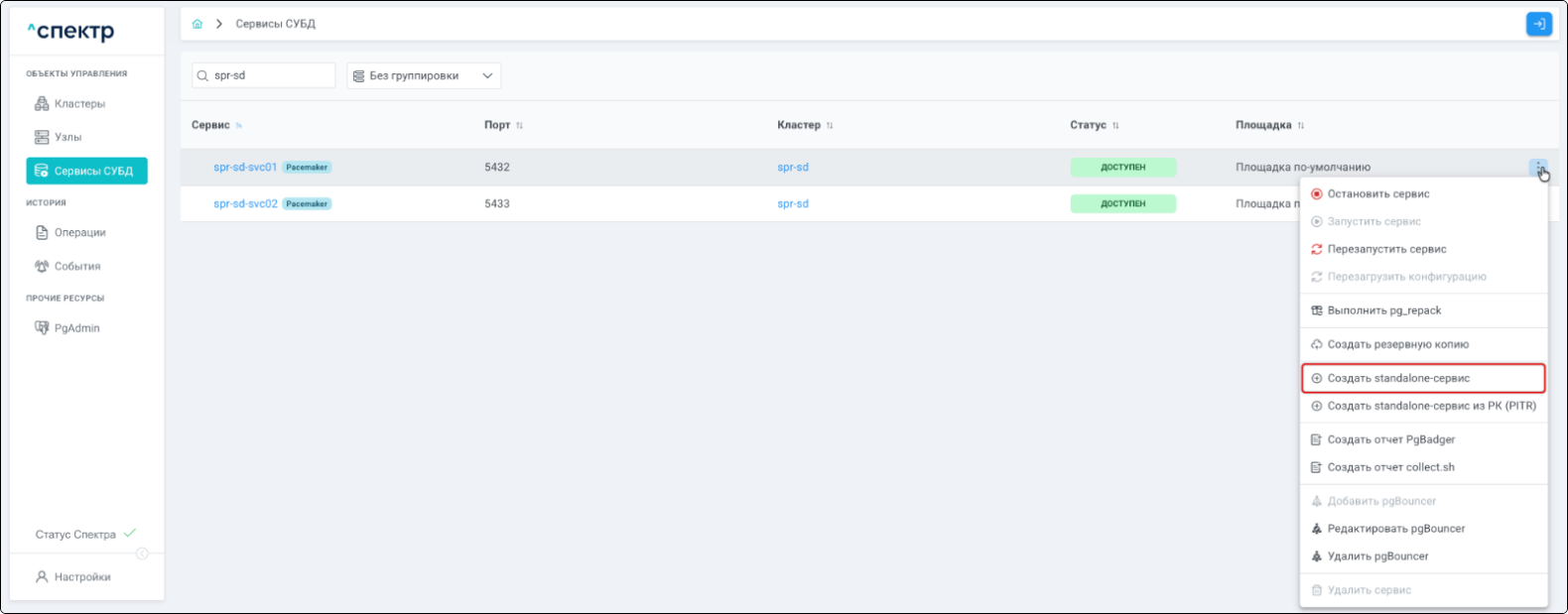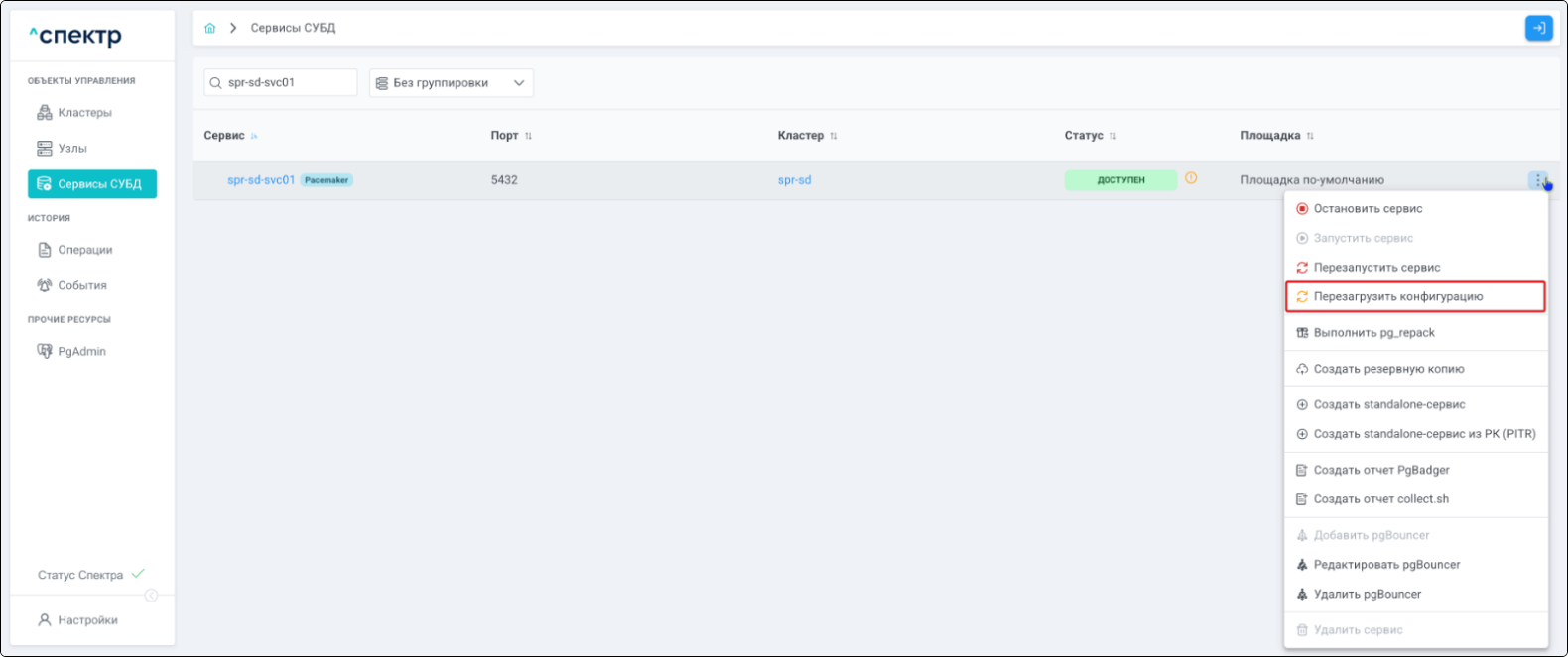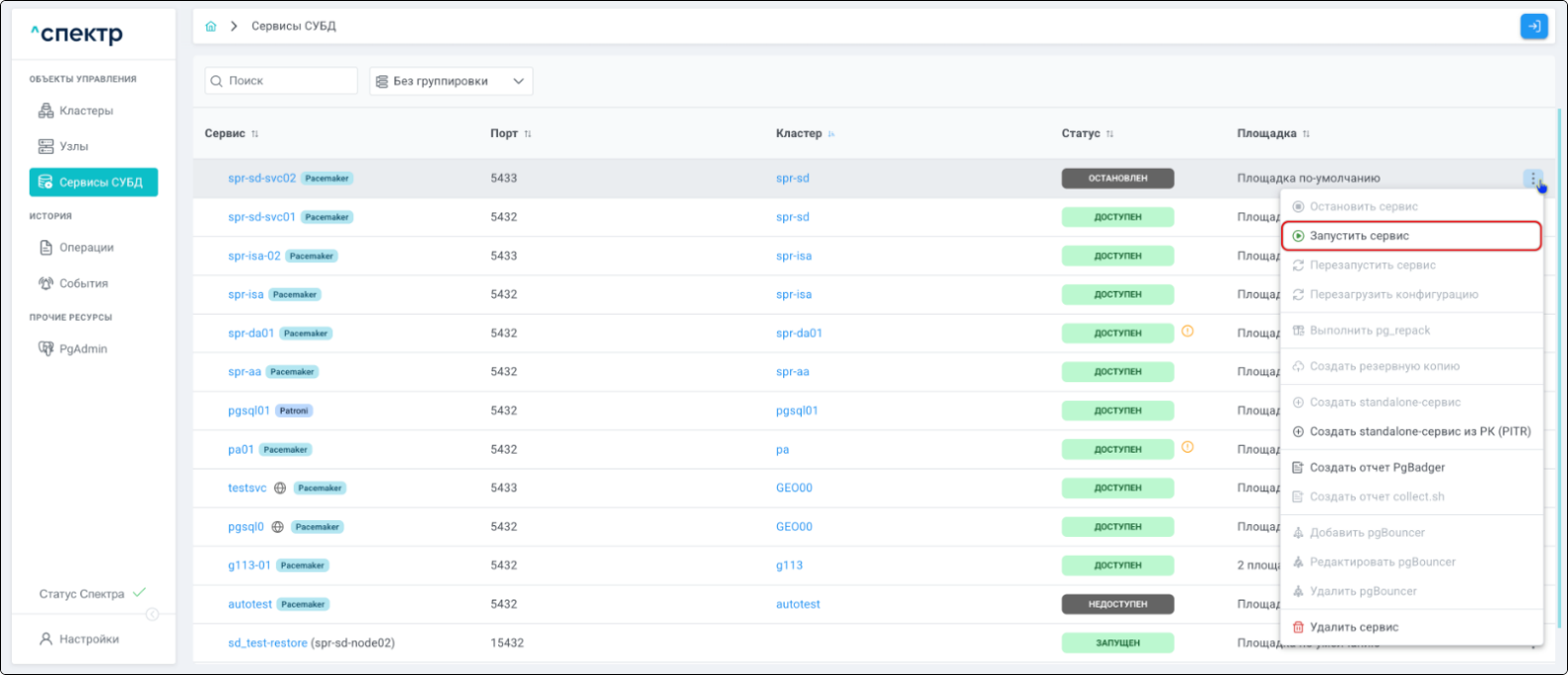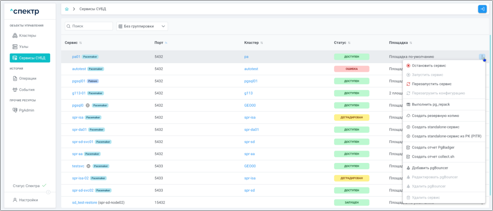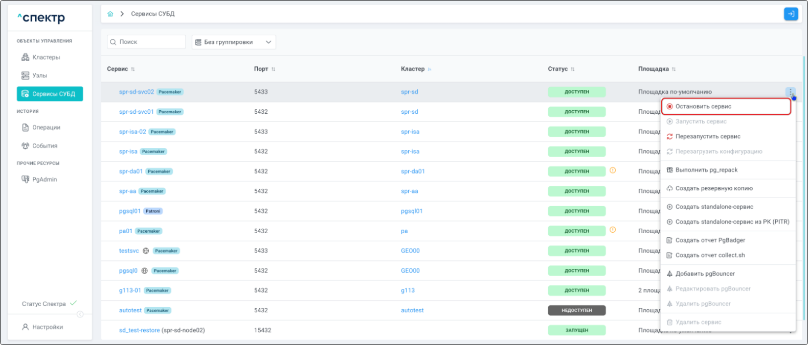 | Если при установке “Спектра” не был введен корректный IP-адрес, по которому доступно ПО “Скала^р Геном-Управление”, пункт меню “Добавить pgBouncer” для всех сервисов будет недоступен. |