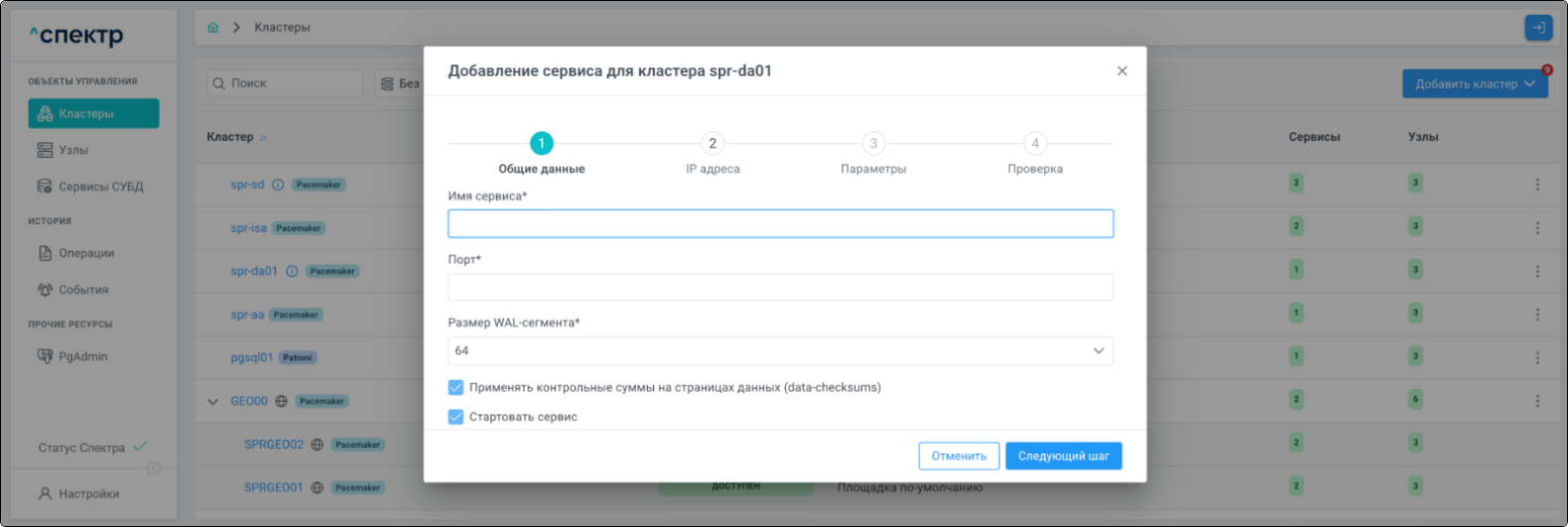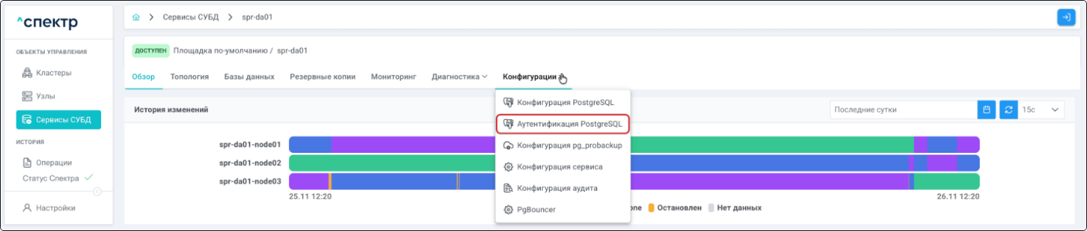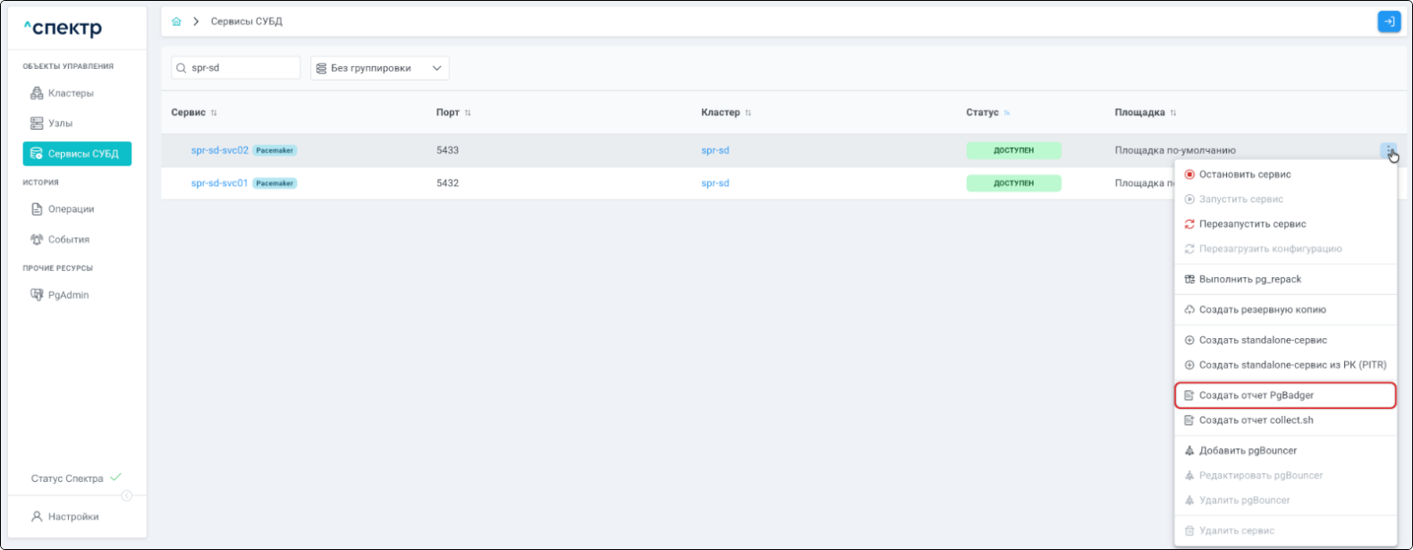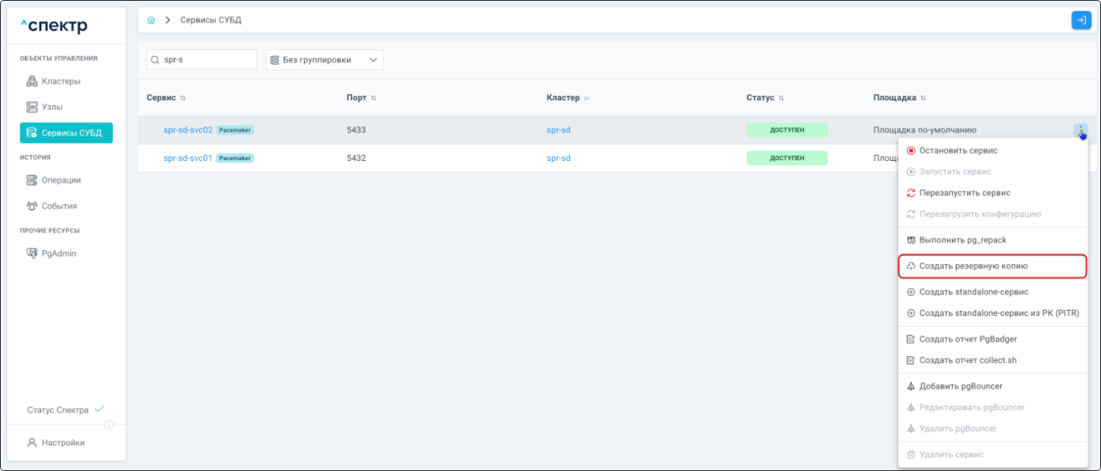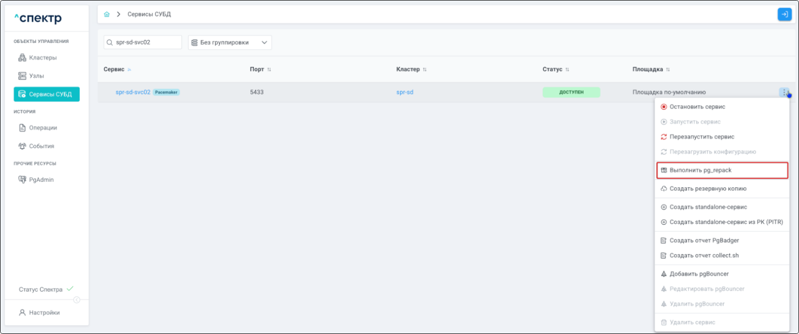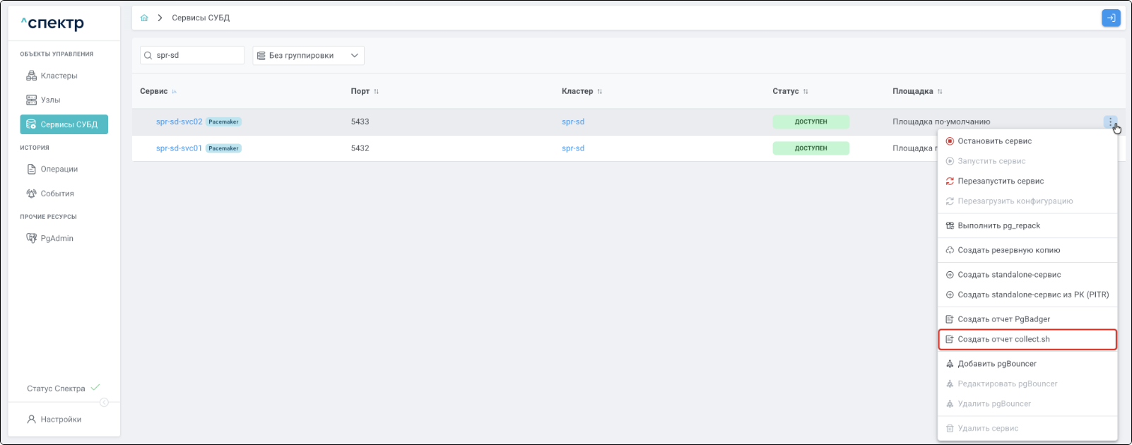 | Если при установке “Спектра” не был введен корректный IP-адрес, по которому доступно ПО “Скала^р Геном-Управление”, пункт меню “Добавить pgBouncer” для всех сервисов будет недоступен. |