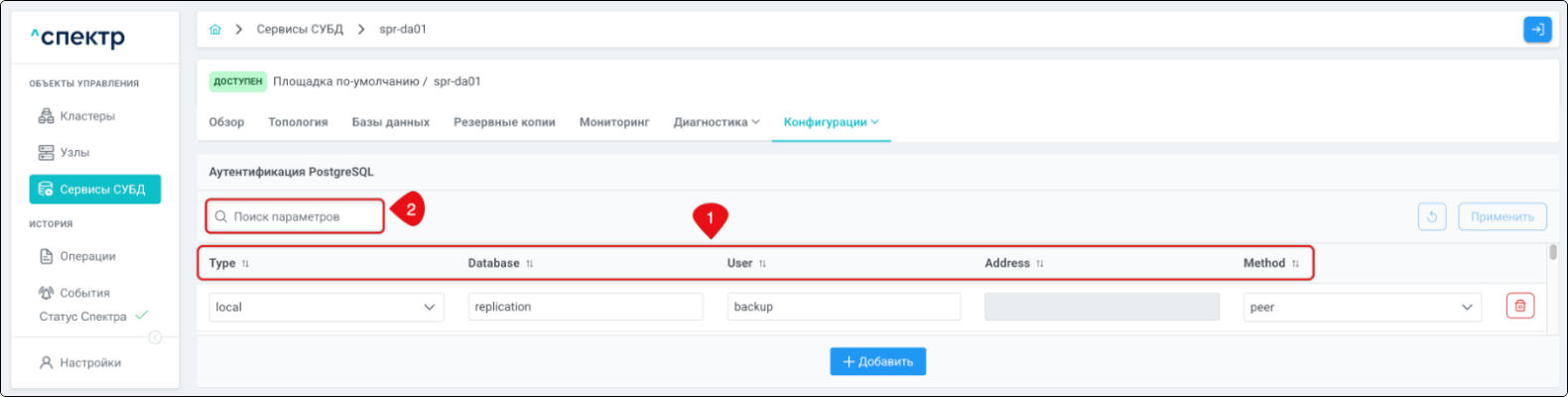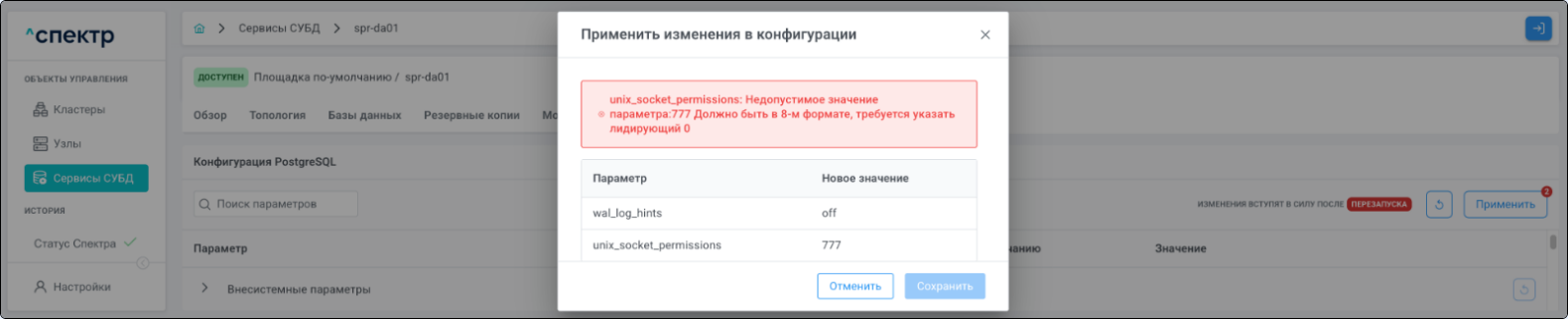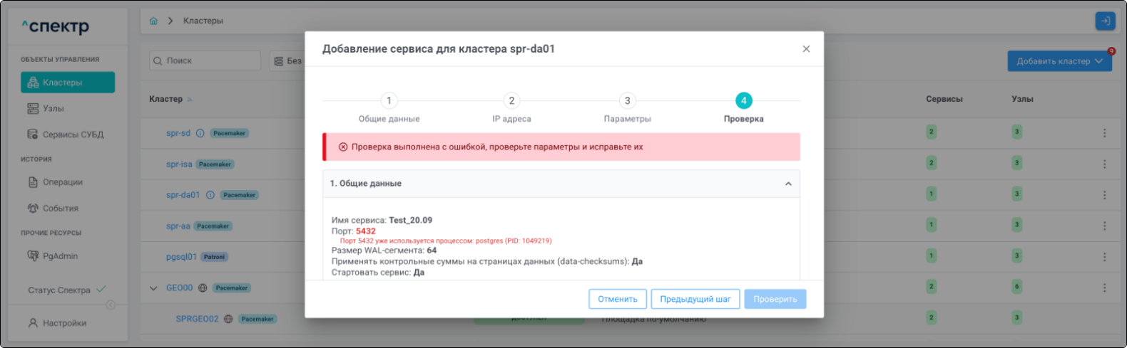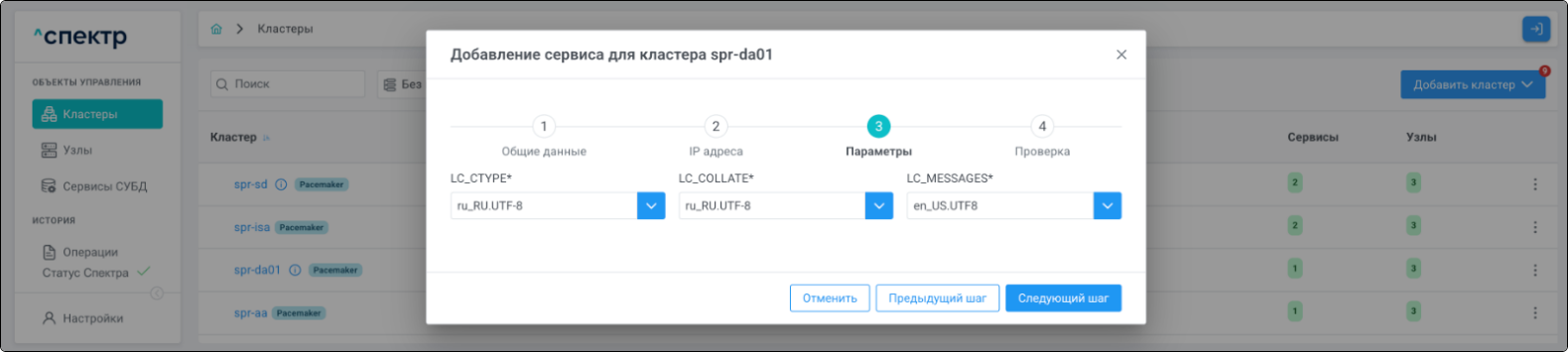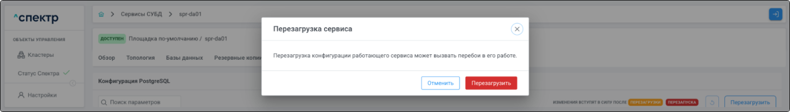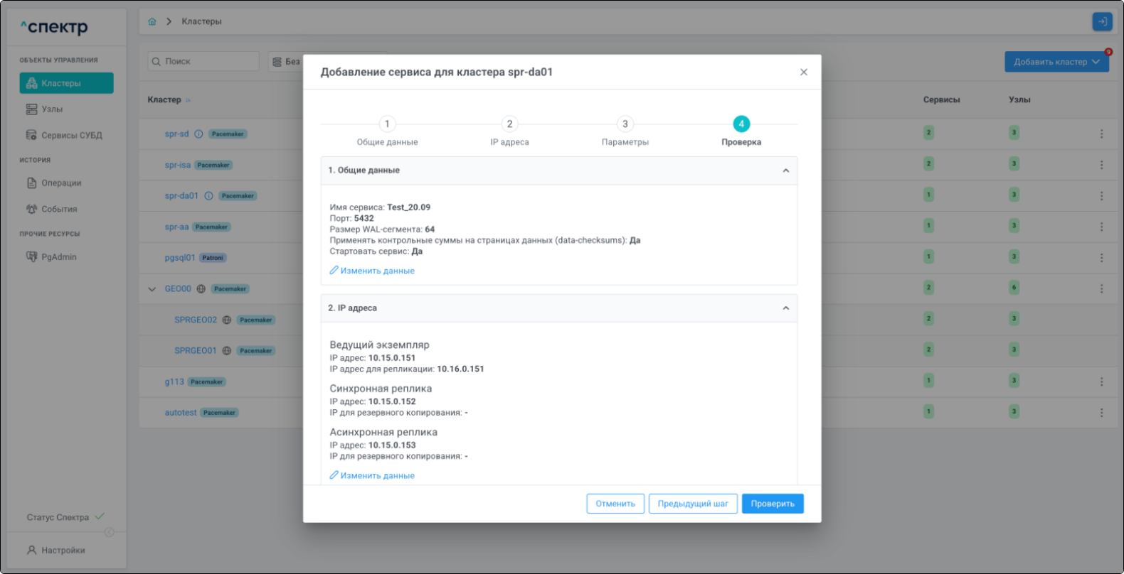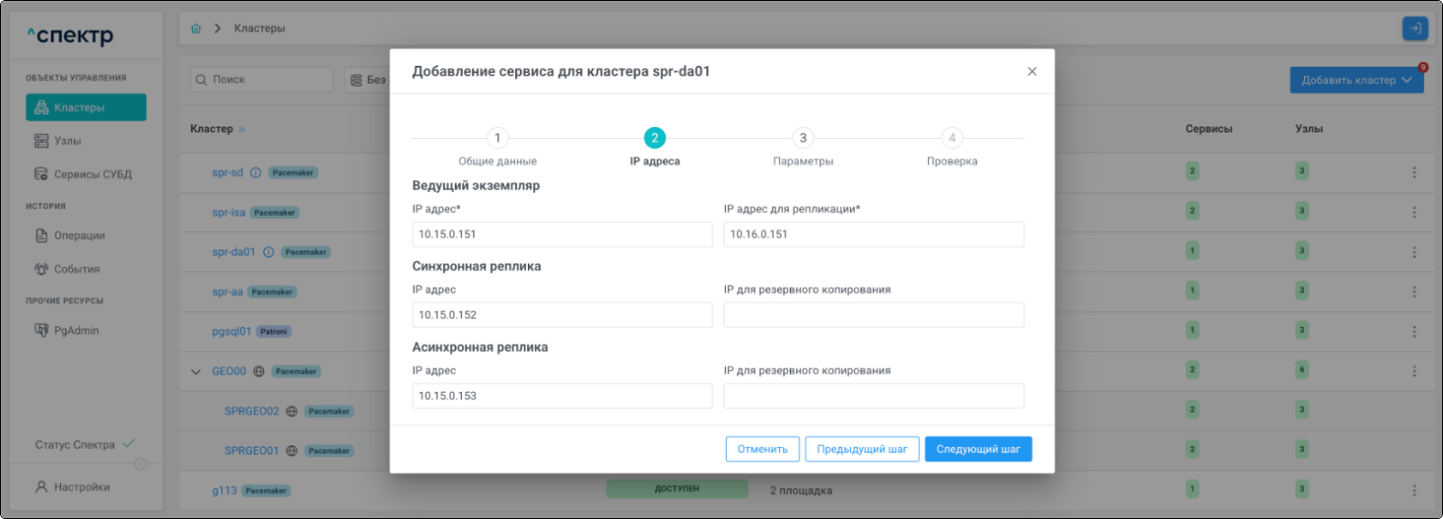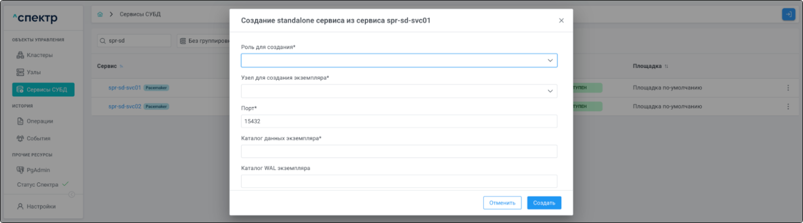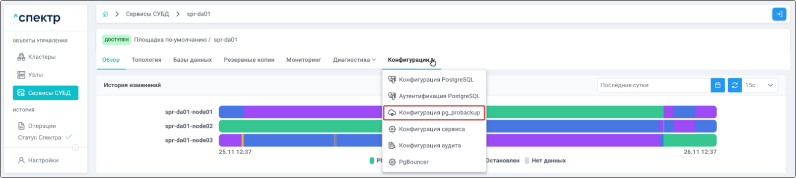 | Если при установке “Спектра” не был введен корректный IP-адрес, по которому доступно ПО “Скала^р Геном-Управление”, пункт меню “Добавить pgBouncer” для всех сервисов будет недоступен. |