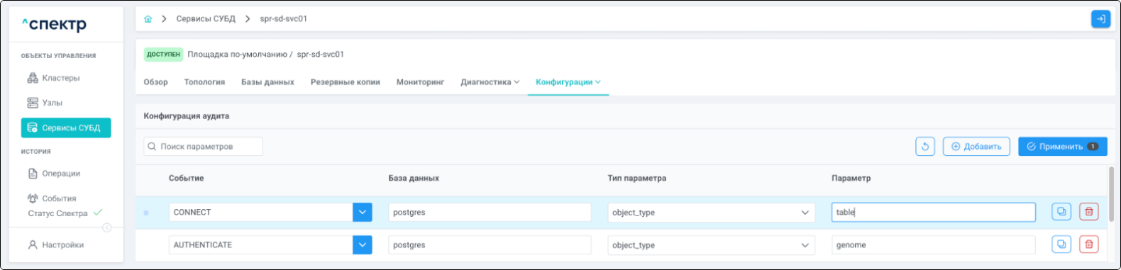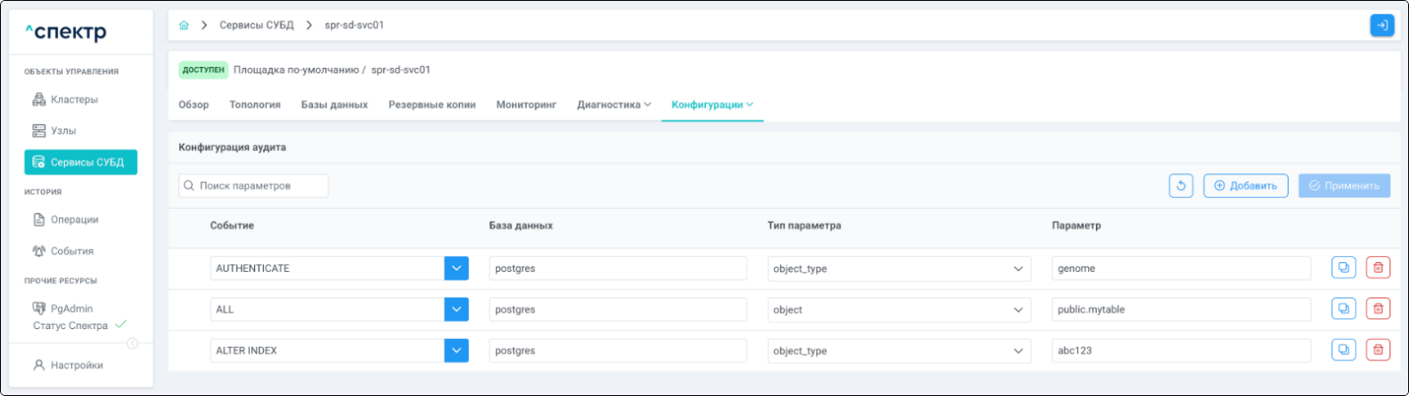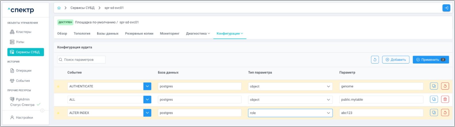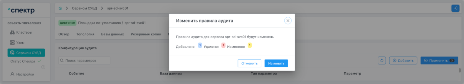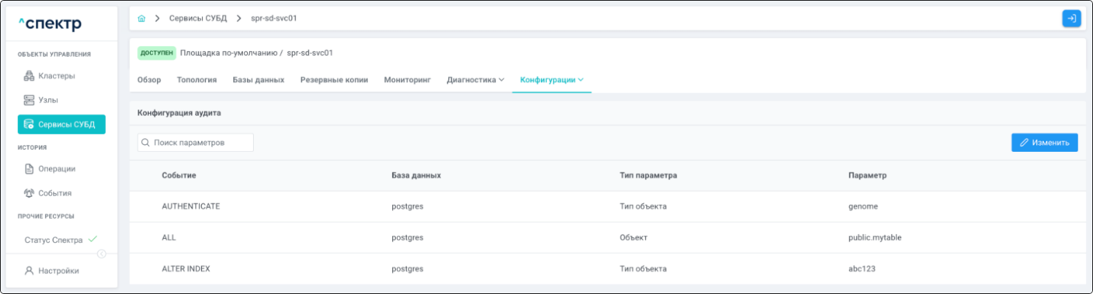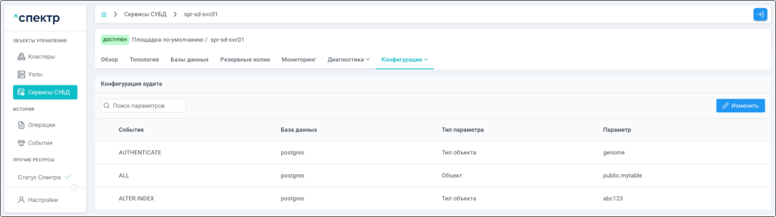 - при переходе на вкладку “Аудит” для сервиса, в котором были созданы / изменены правила аудита, отображается их список.