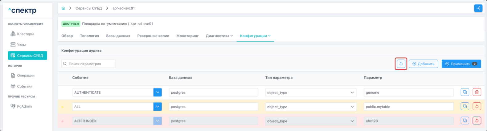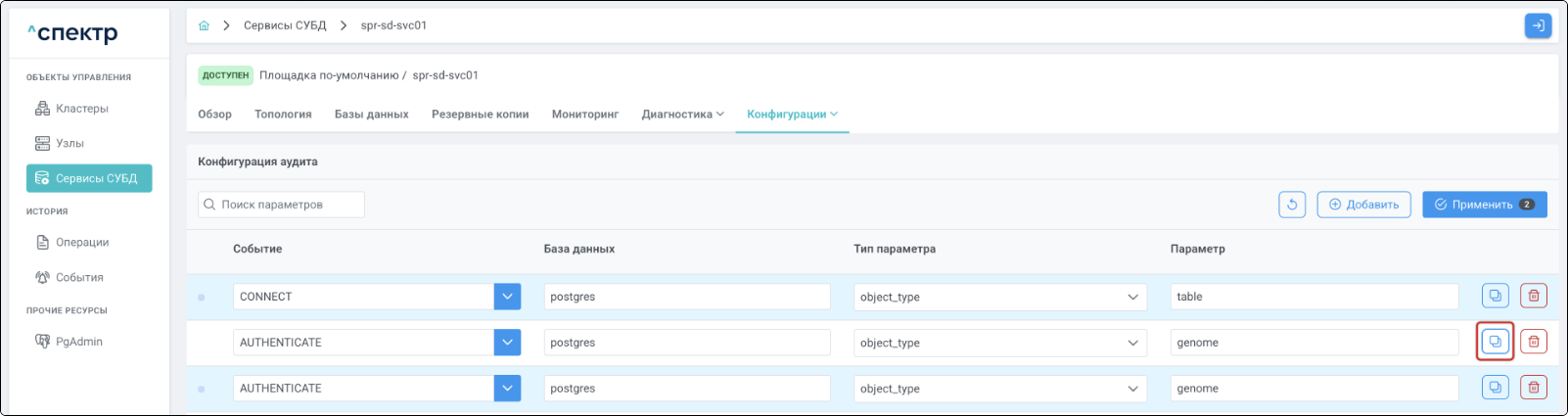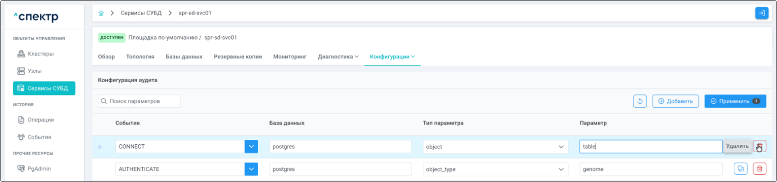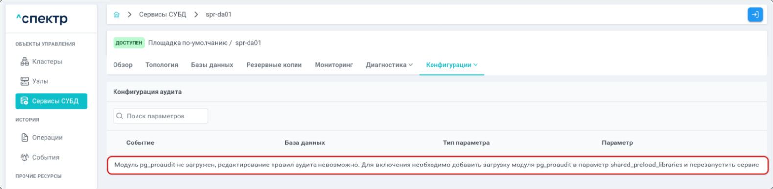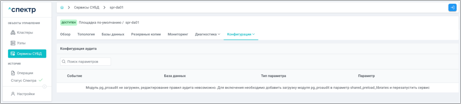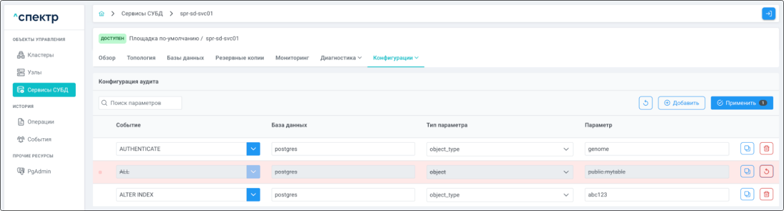 - при переходе на вкладку “Аудит” для сервиса, в котором были созданы / изменены правила аудита, отображается их список.