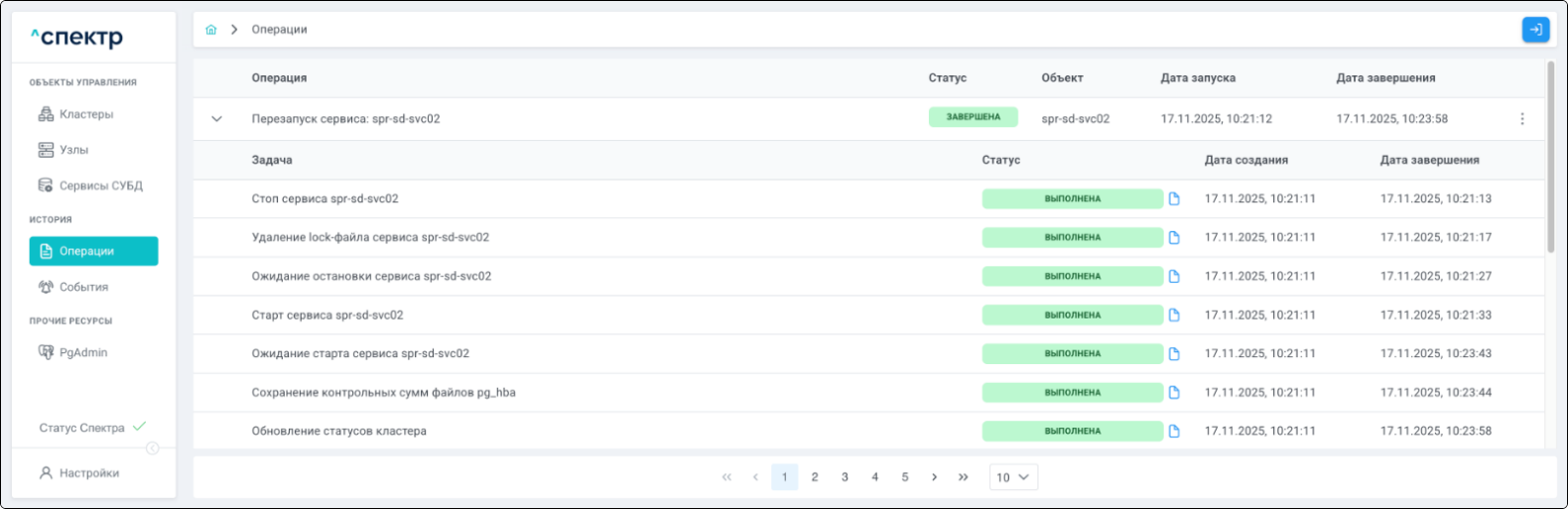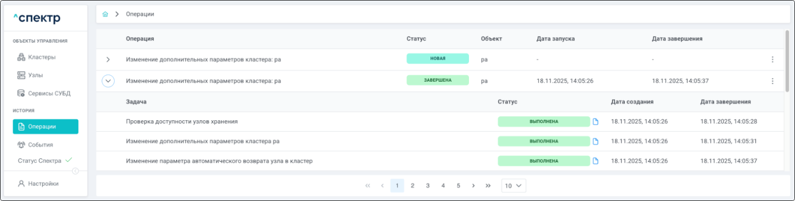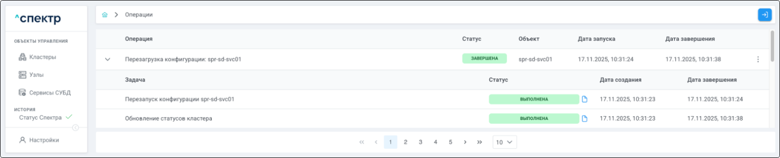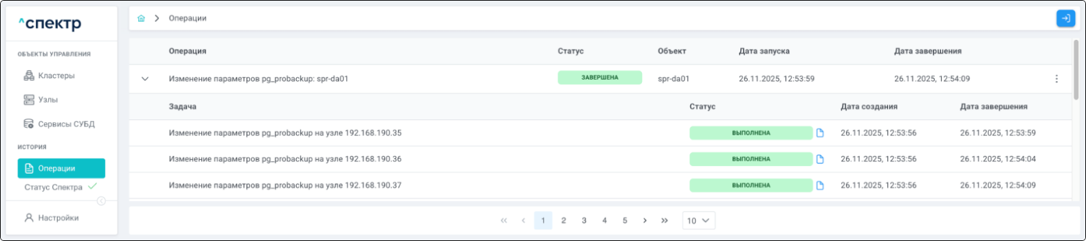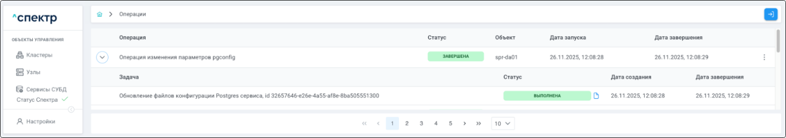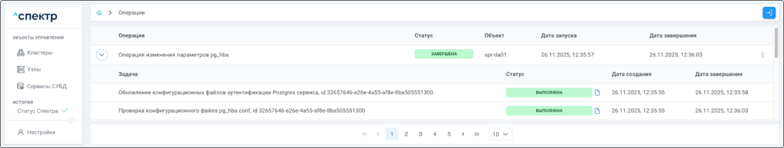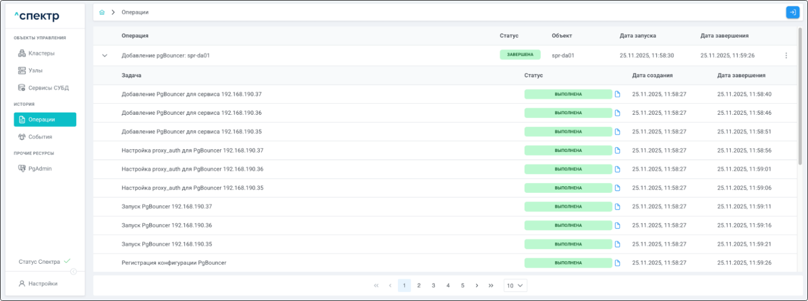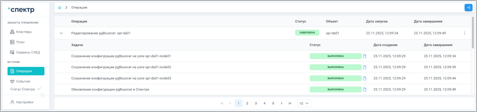 По нажатию кнопки “Перейти” во всплывающем сообщении будет осуществлен переход на страницу “Операции”. В верхней строке таблицы операций отображается операция редактирования pgBouncer и статус её выполнения.