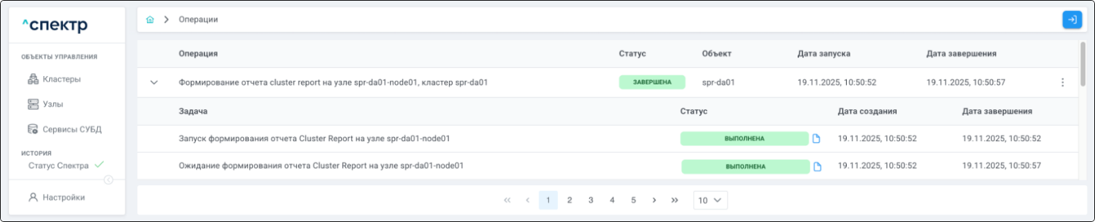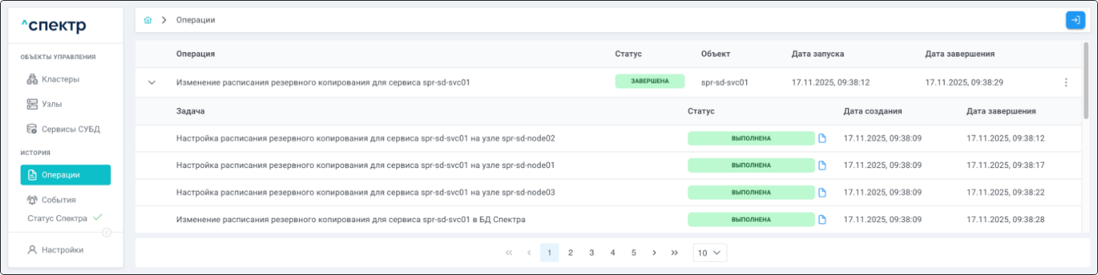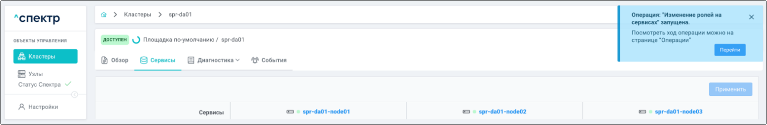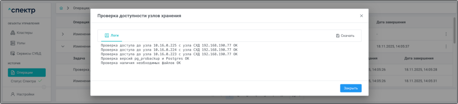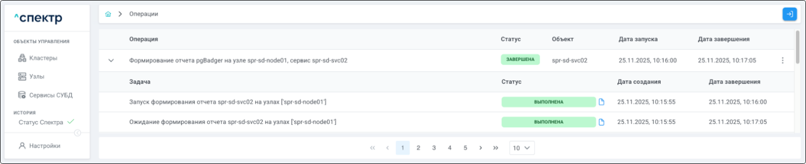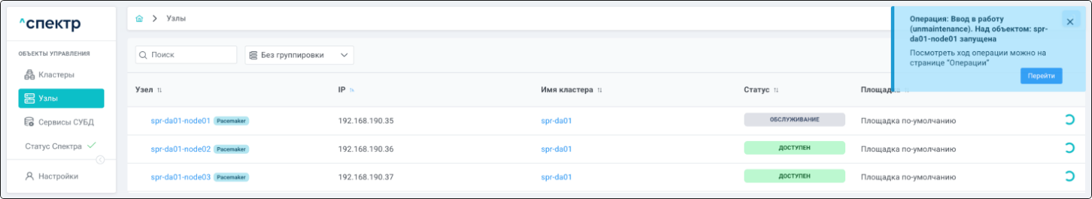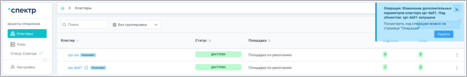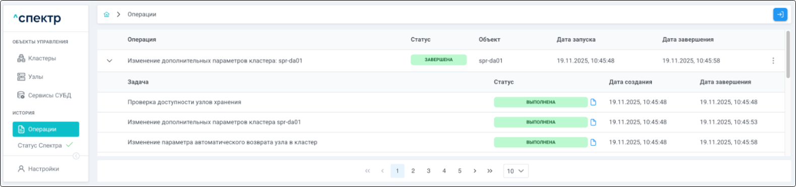 По нажатию кнопки “Перейти” во всплывающем сообщении будет осуществлен переход на страницу “Операции”. В верхней строке таблицы операций отображается операция редактирования pgBouncer и статус её выполнения.