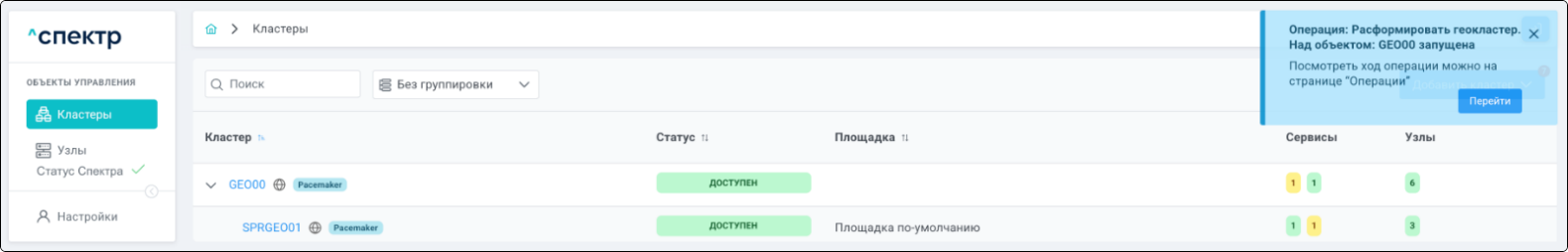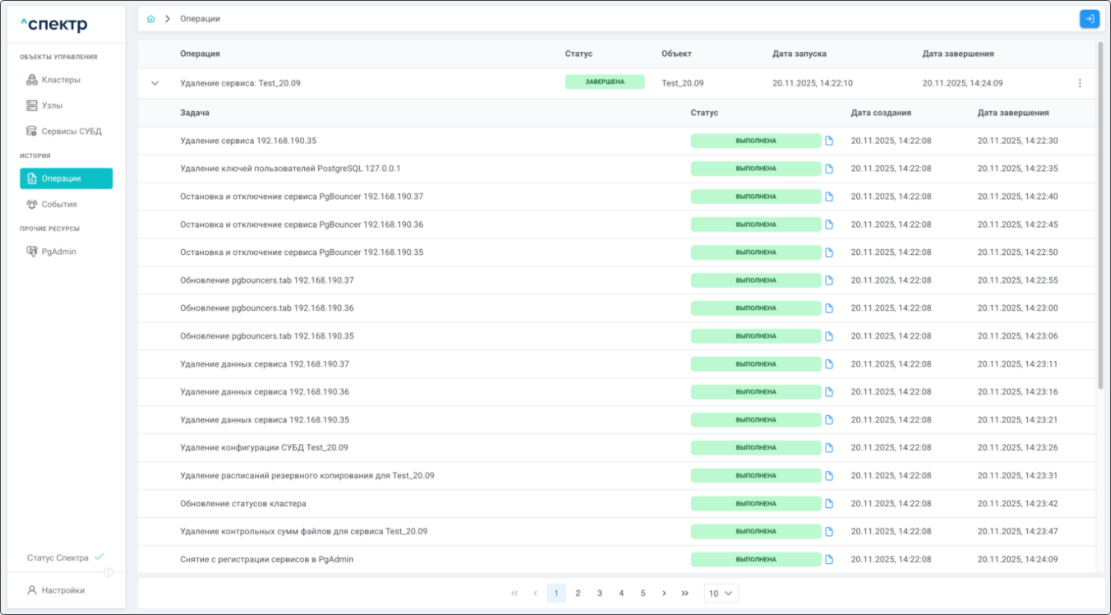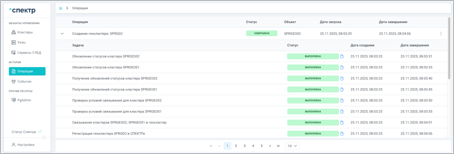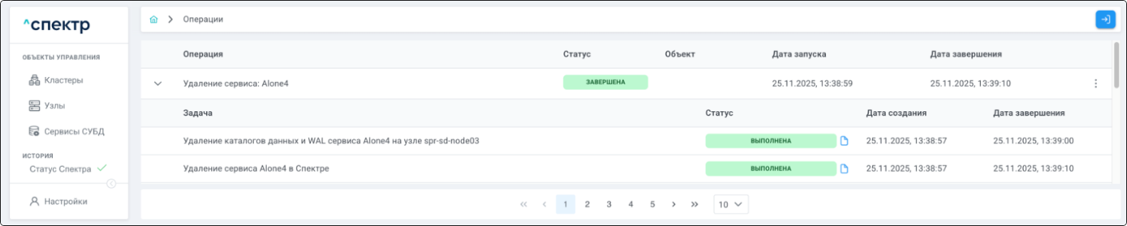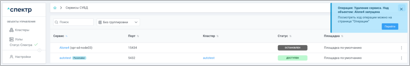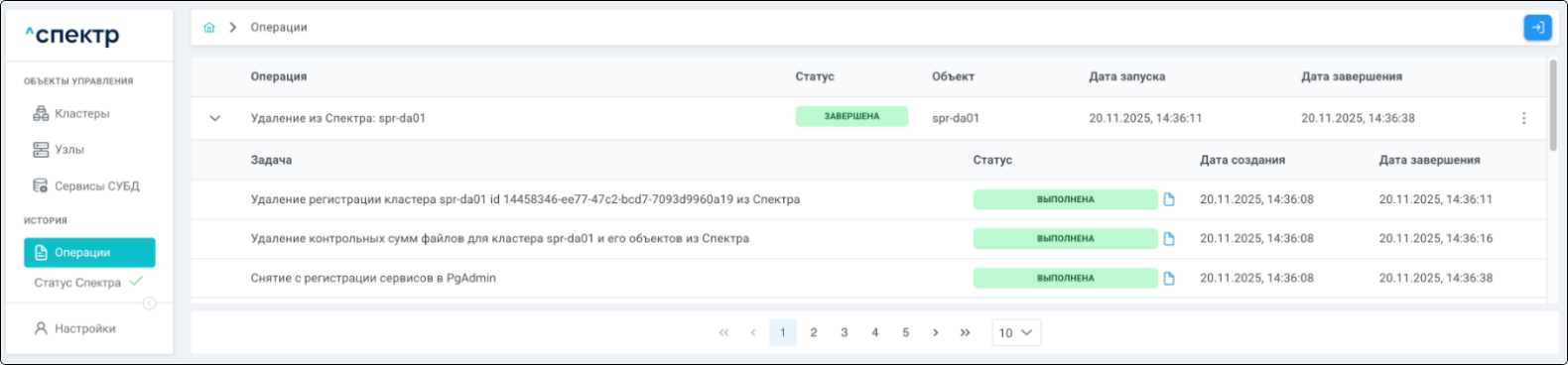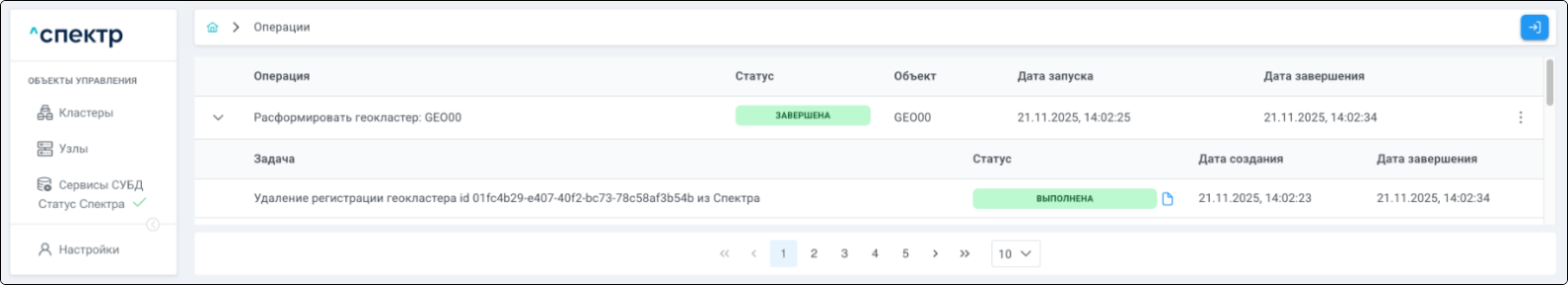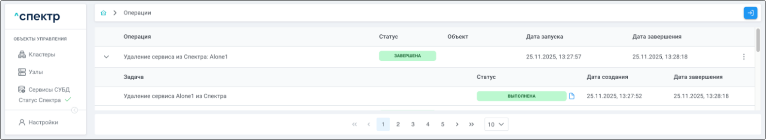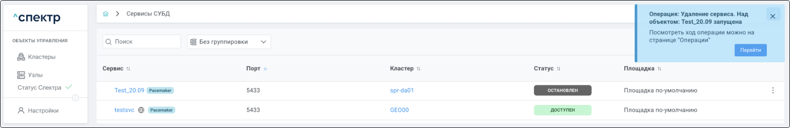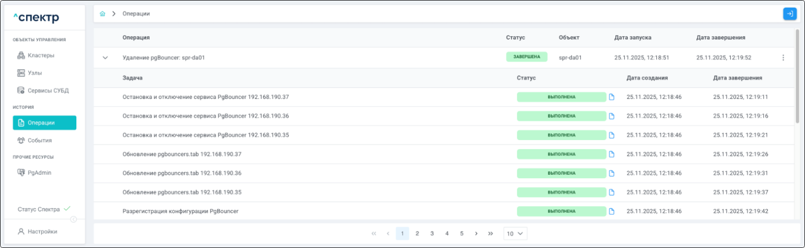 По нажатию кнопки “Перейти” во всплывающем сообщении будет осуществлен переход на страницу “Операции”. В верхней строке таблицы операций отображается операция удаления pgBouncer и статус её выполнения.