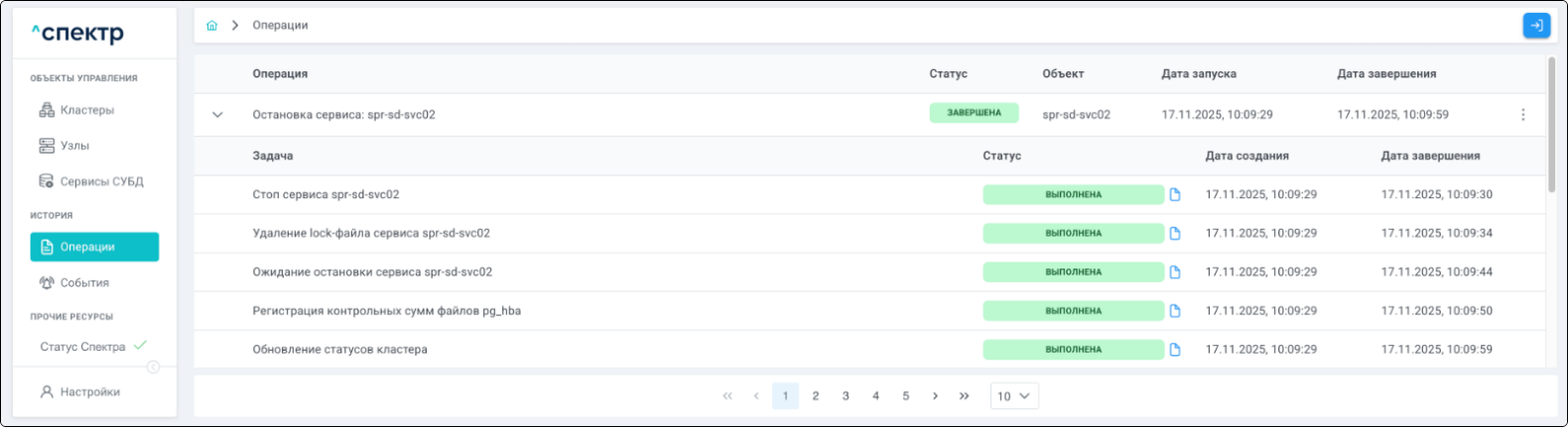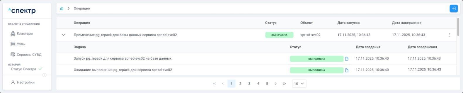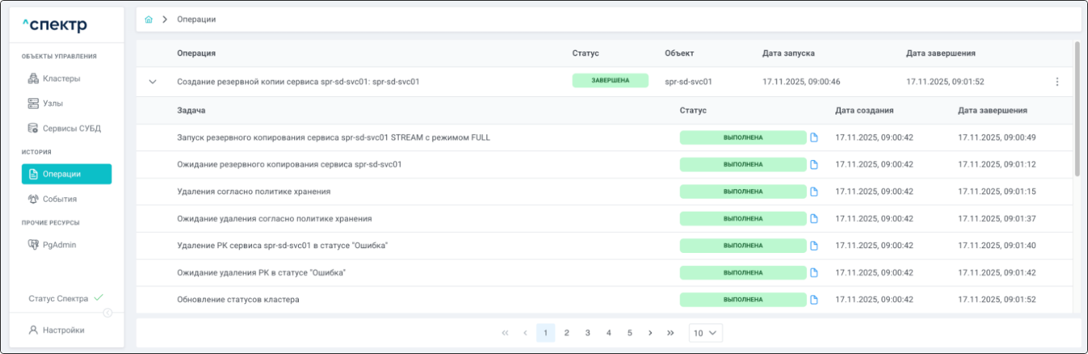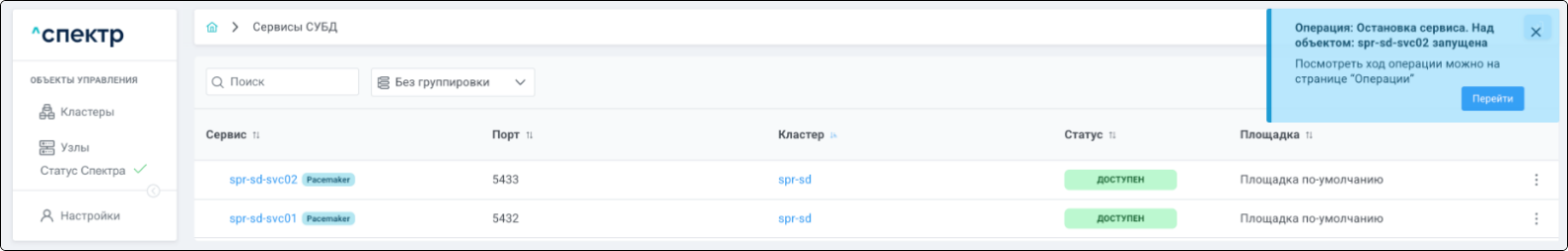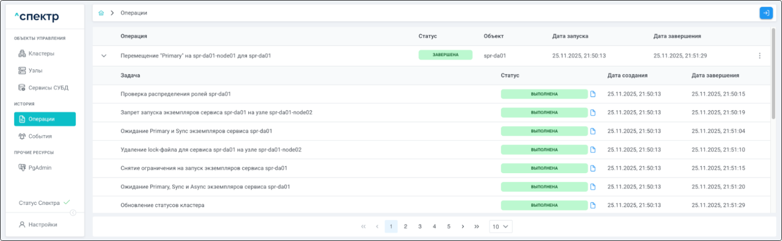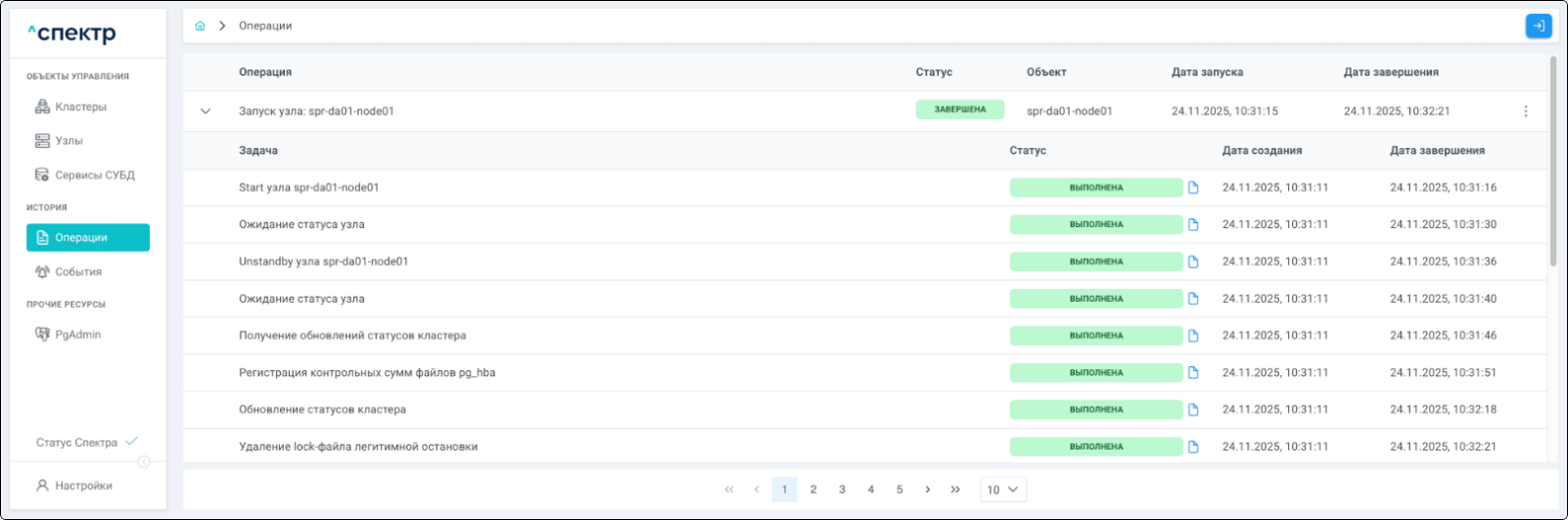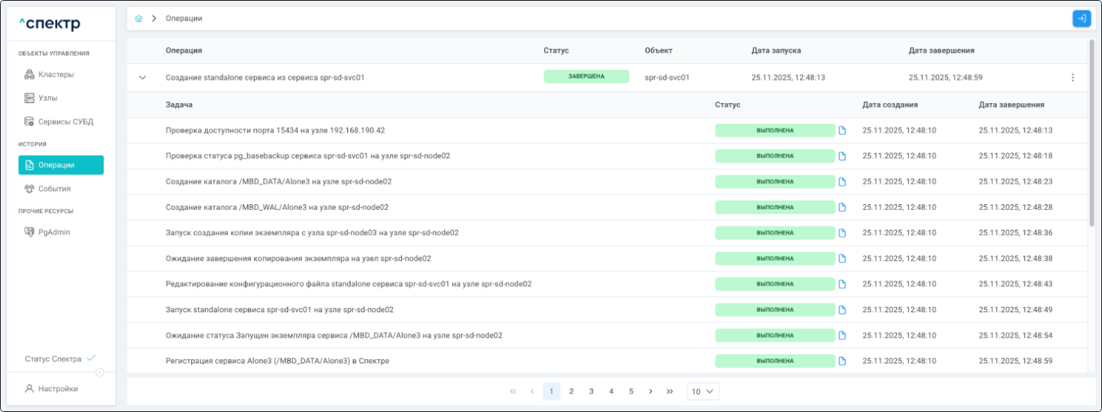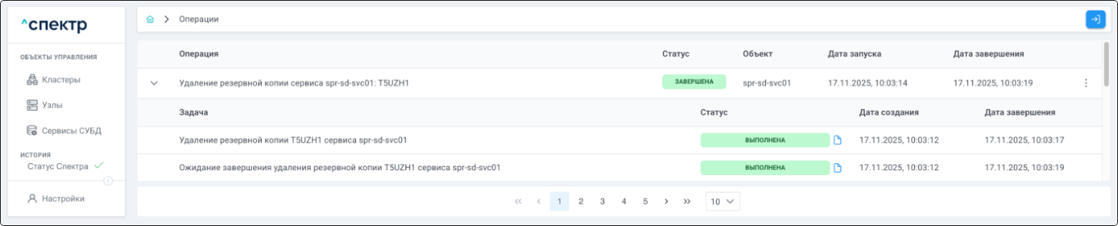 По нажатию кнопки “Перейти” во всплывающем сообщении будет осуществлен переход на страницу “Операции”. В верхней строке таблицы операций отображается операция удаления pgBouncer и статус её выполнения.