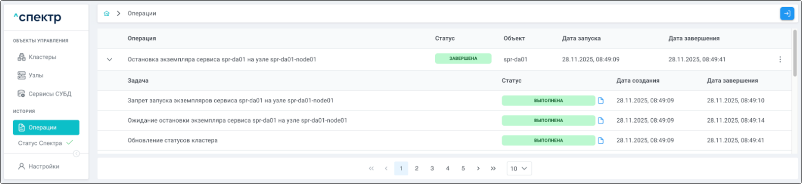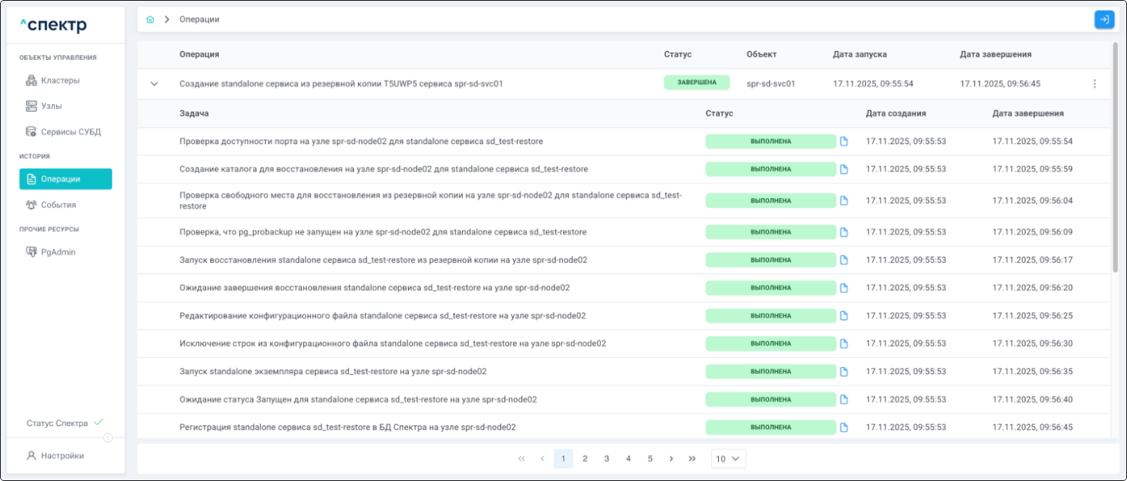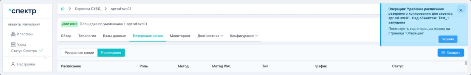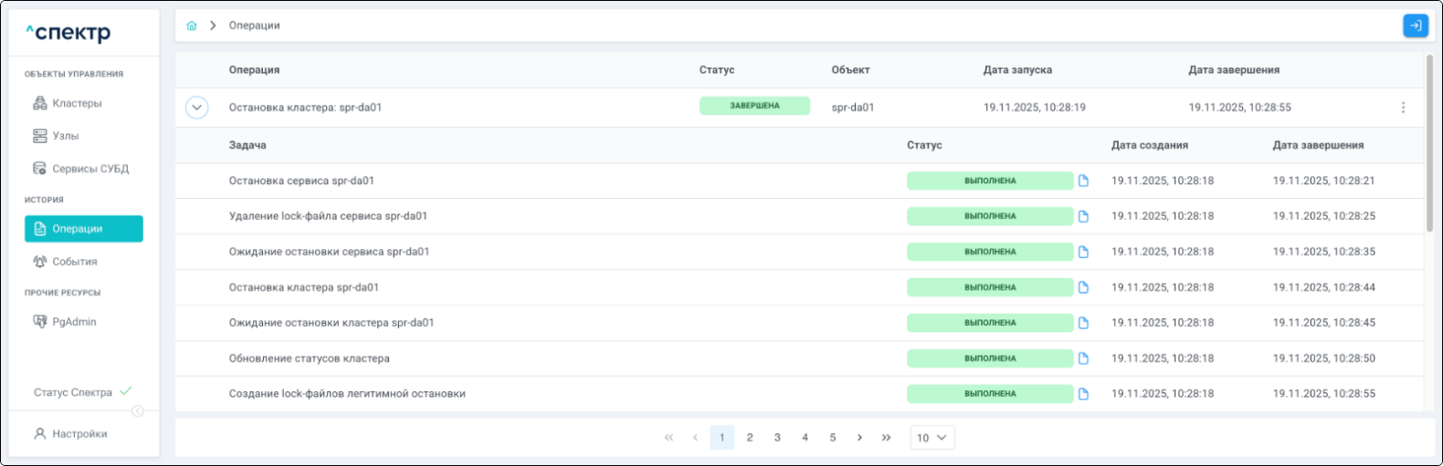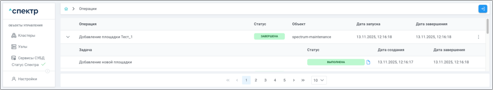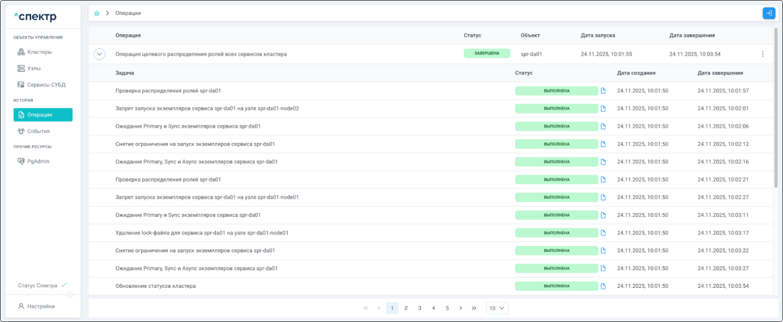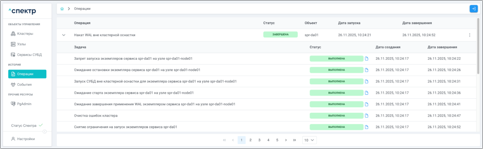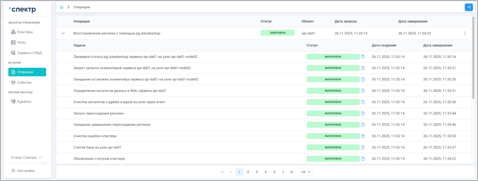 По нажатию кнопки “Перейти” во всплывающем сообщении будет осуществлен переход на страницу “Операции”. В верхней строке таблицы операций отображается операция удаления pgBouncer и статус её выполнения.
