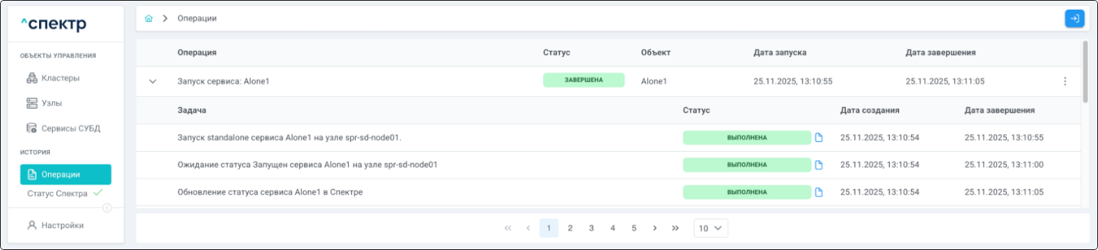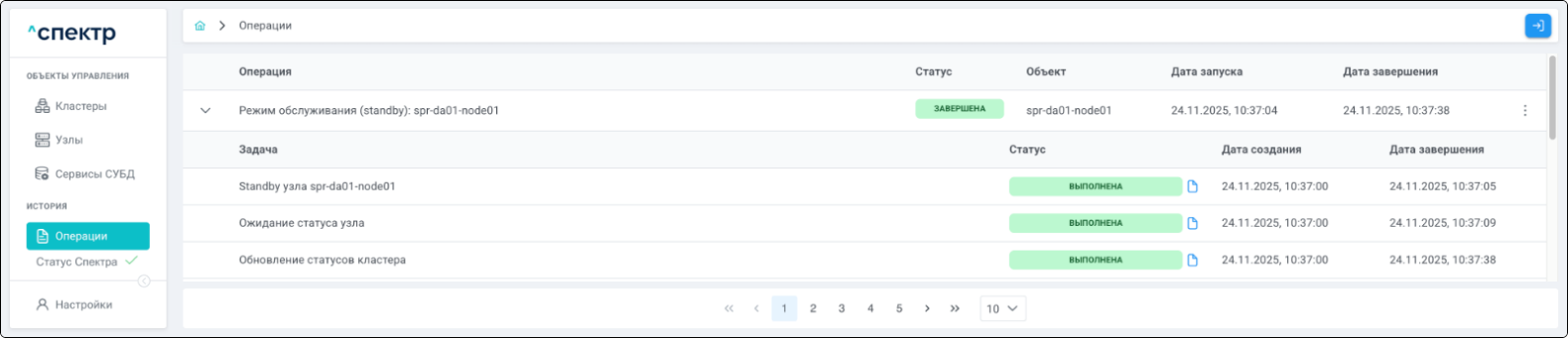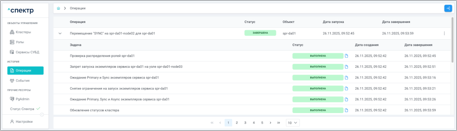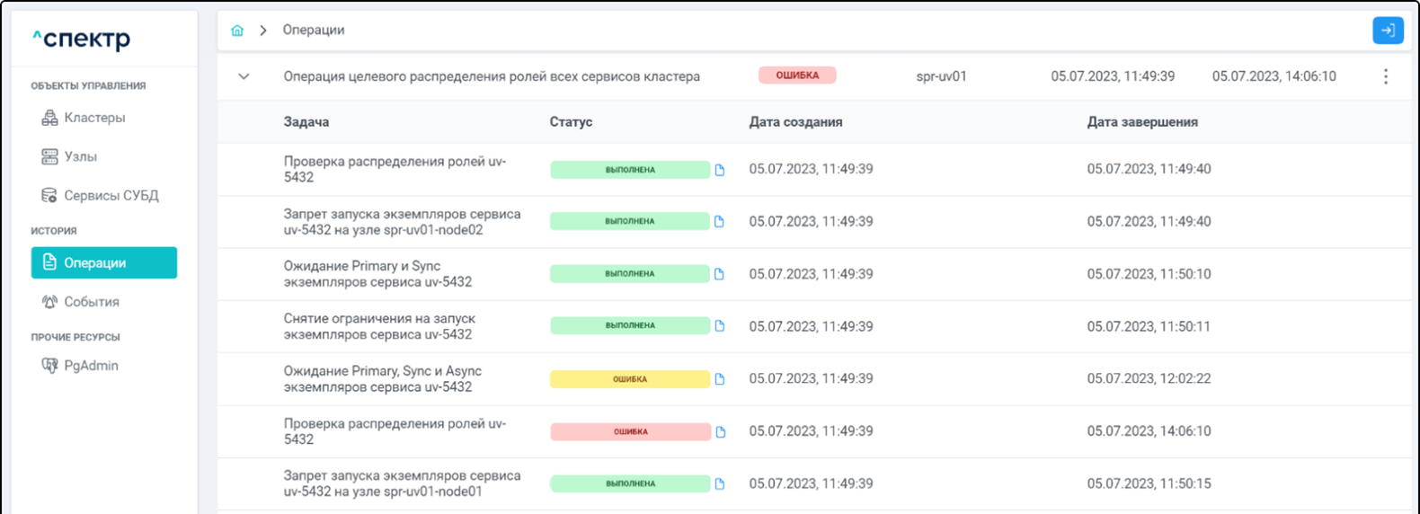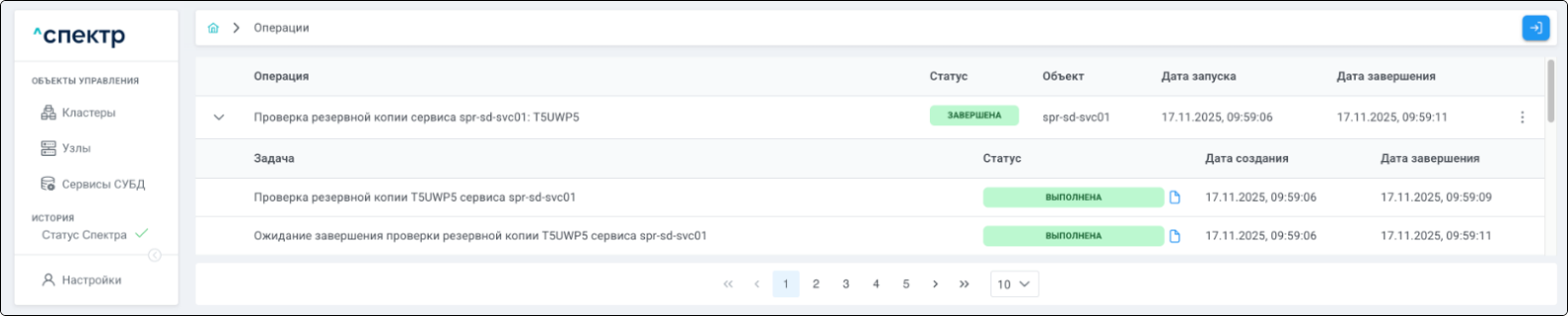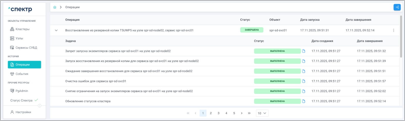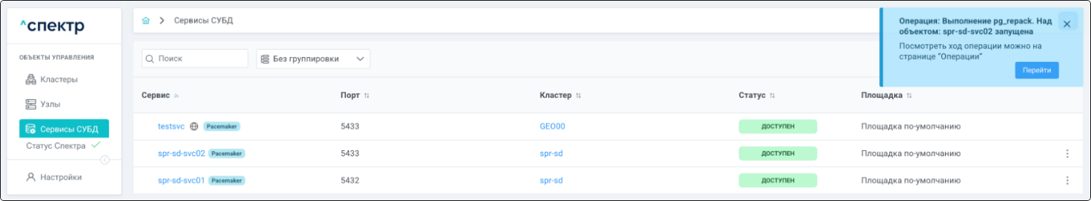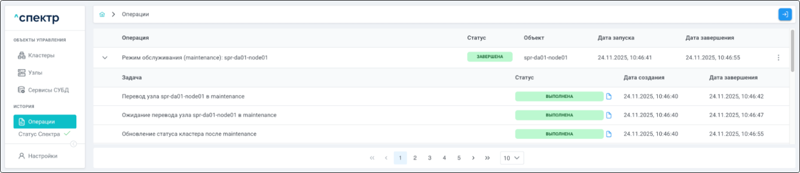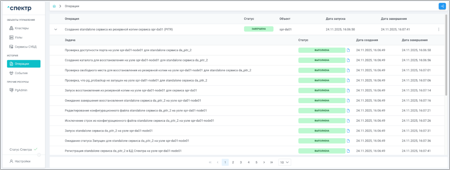 По нажатию кнопки “Перейти” во всплывающем сообщении будет осуществлен переход на страницу “Операции”. В верхней строке таблицы операций отображается операция удаления pgBouncer и статус её выполнения.