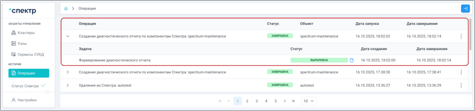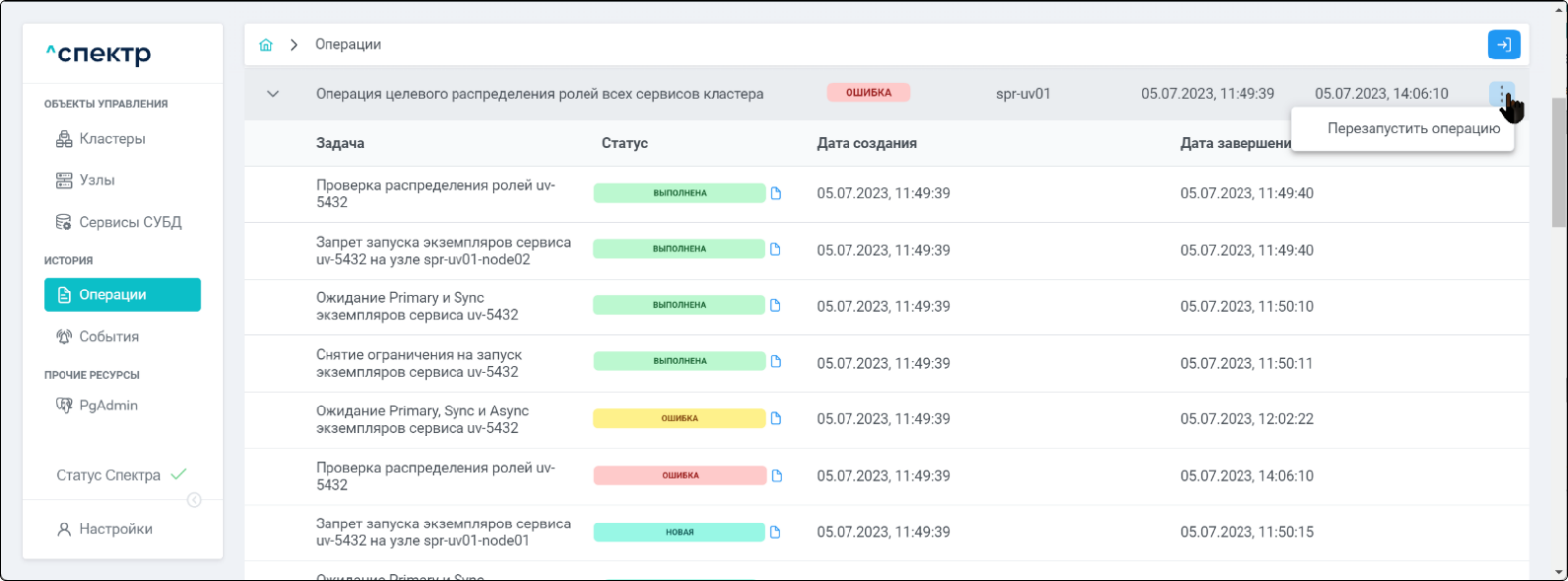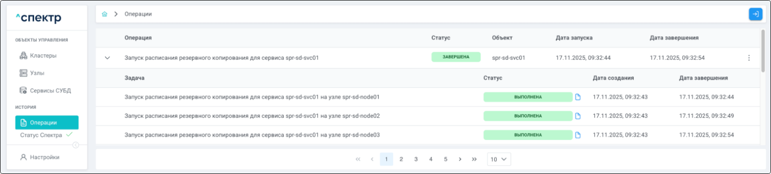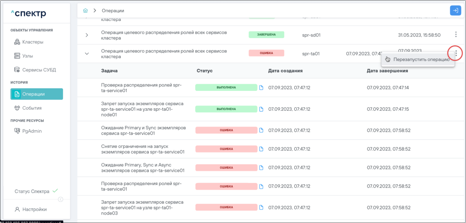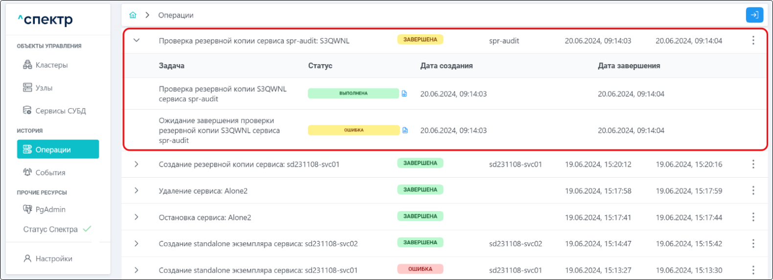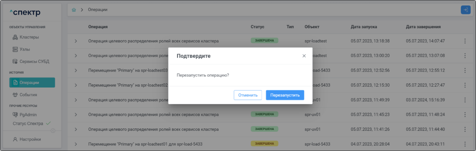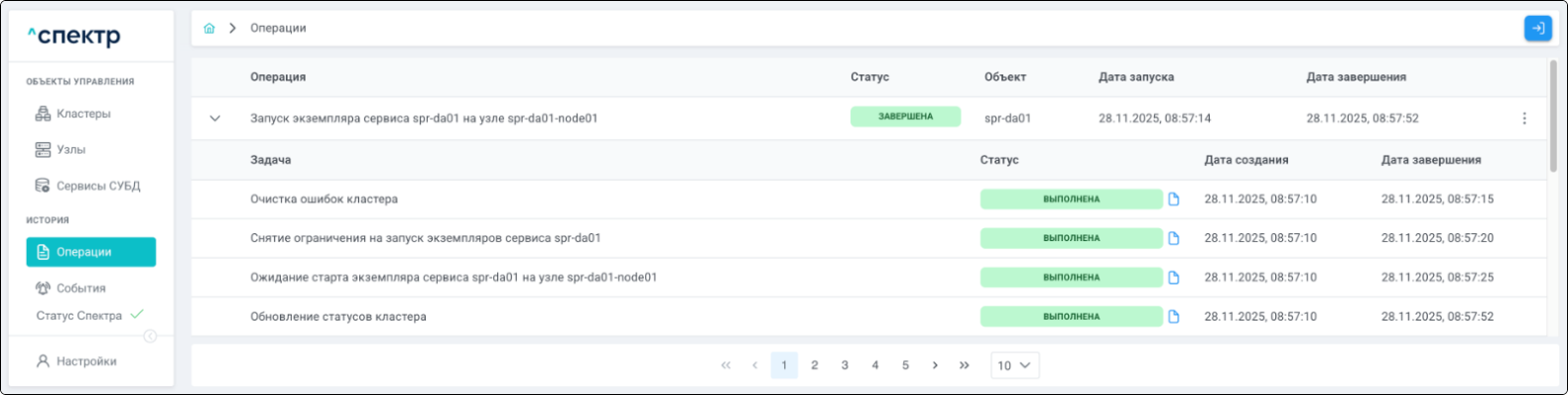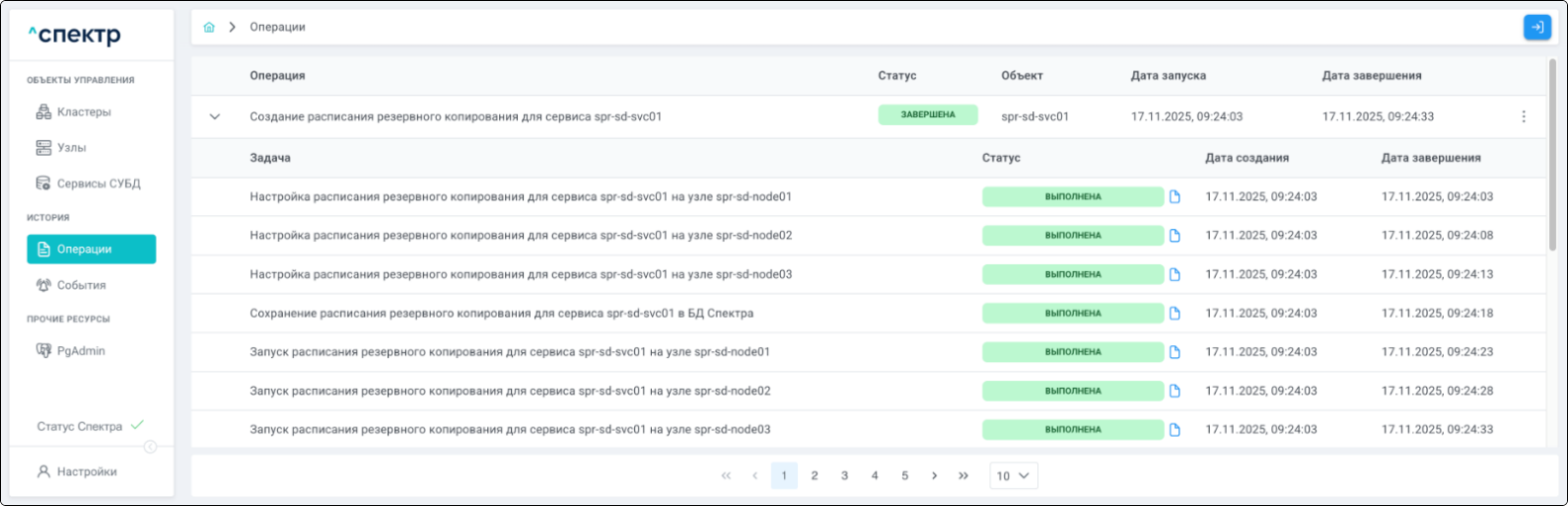 По нажатию кнопки “Перейти” во всплывающем сообщении будет осуществлен переход на страницу “Операции”. В верхней строке таблицы операций отображается операция удаления pgBouncer и статус её выполнения.