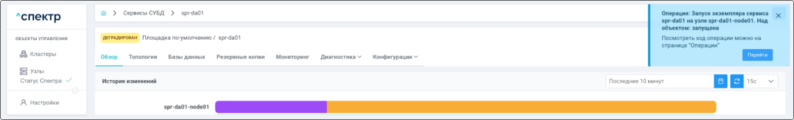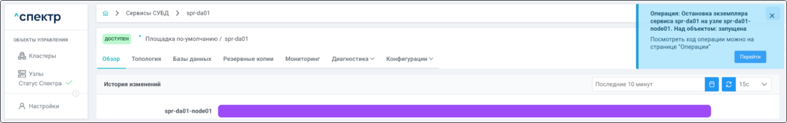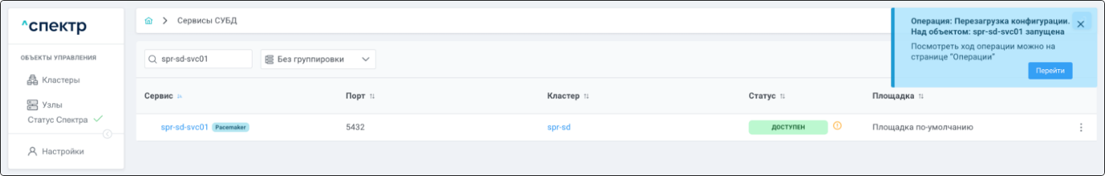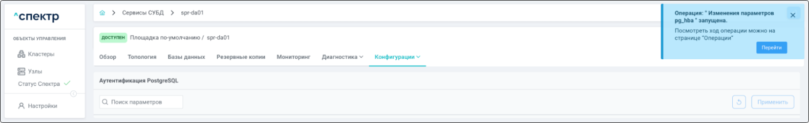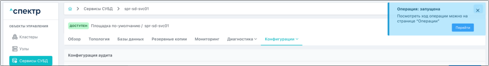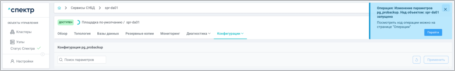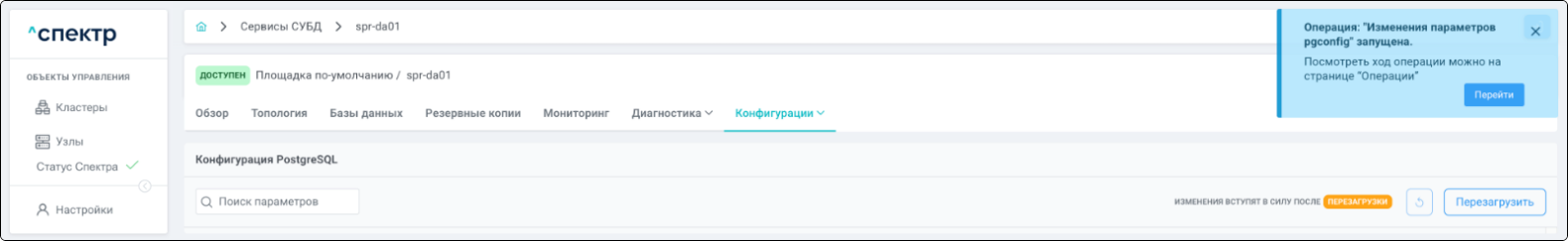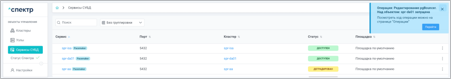 В правом верхнем углу страницы появится всплывающее сообщение о запуске операции редактирования pgBouncer: