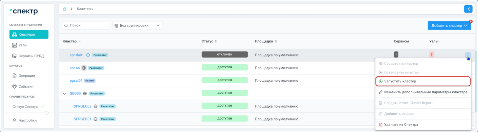 Для кластеров Pacemaker/Corosync доступны операции: