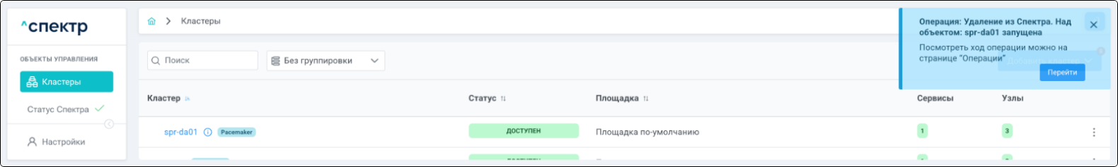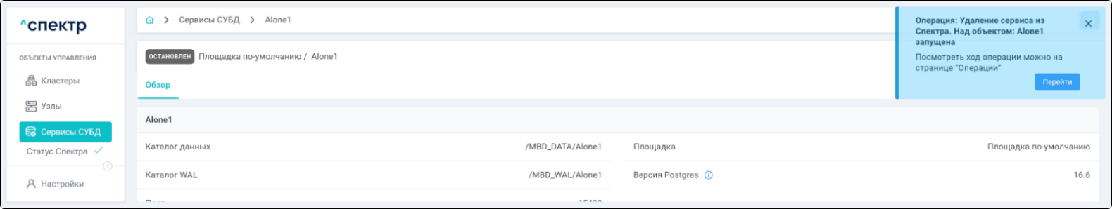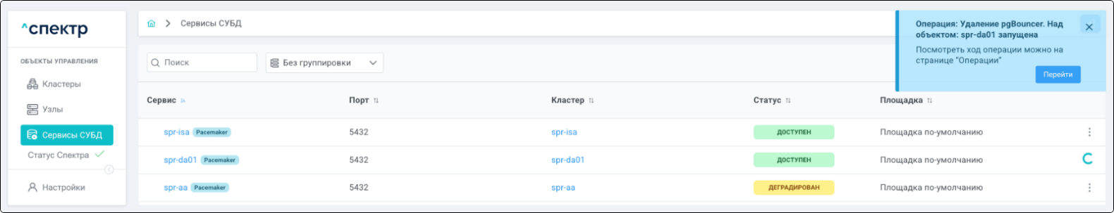 В правом верхнем углу страницы появится всплывающее сообщение о запуске операции удаления pgBouncer: