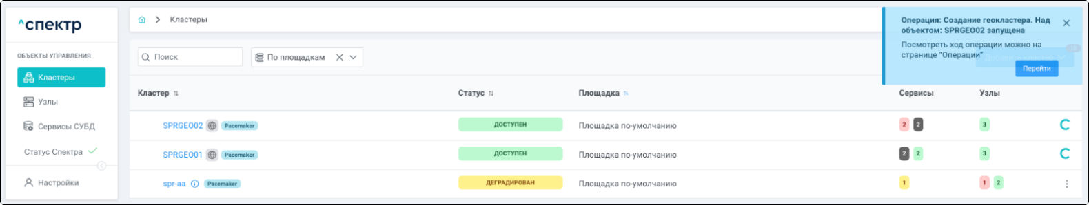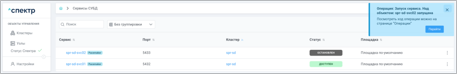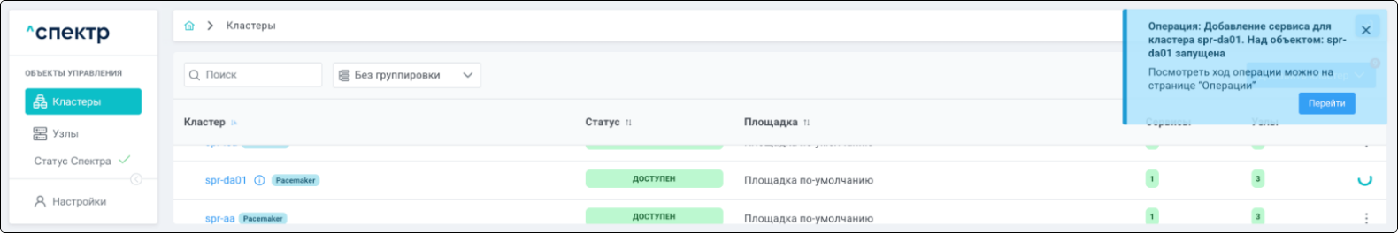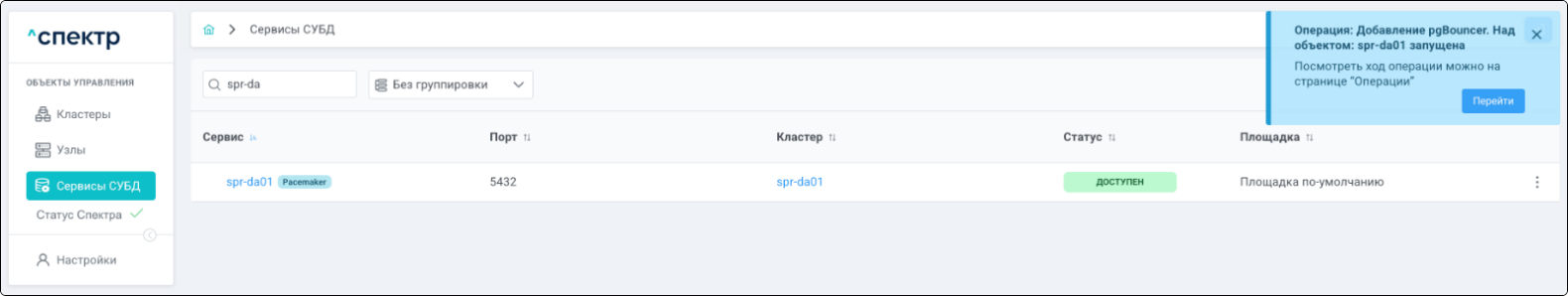 По нажатию кнопки “Перейти” во всплывающем сообщении будет осуществлен переход на страницу “Операции”. В верхней строке таблицы операций отображается операция добавления pgBouncer и статус её выполнения.