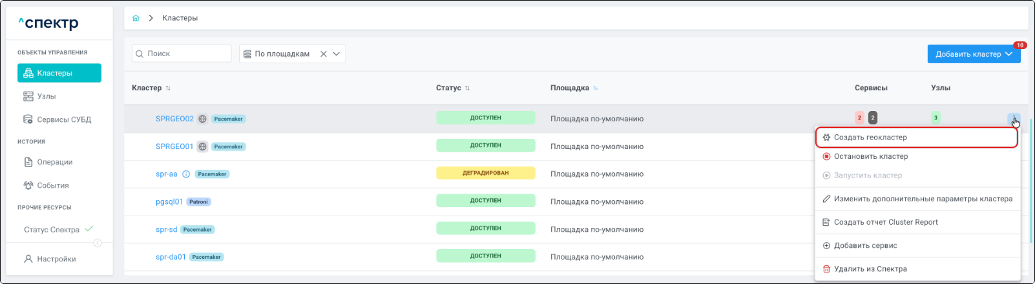 Для геокластеров Pacemaker/Corosync доступны операции: