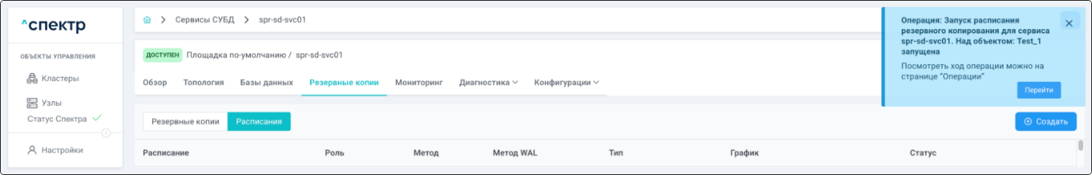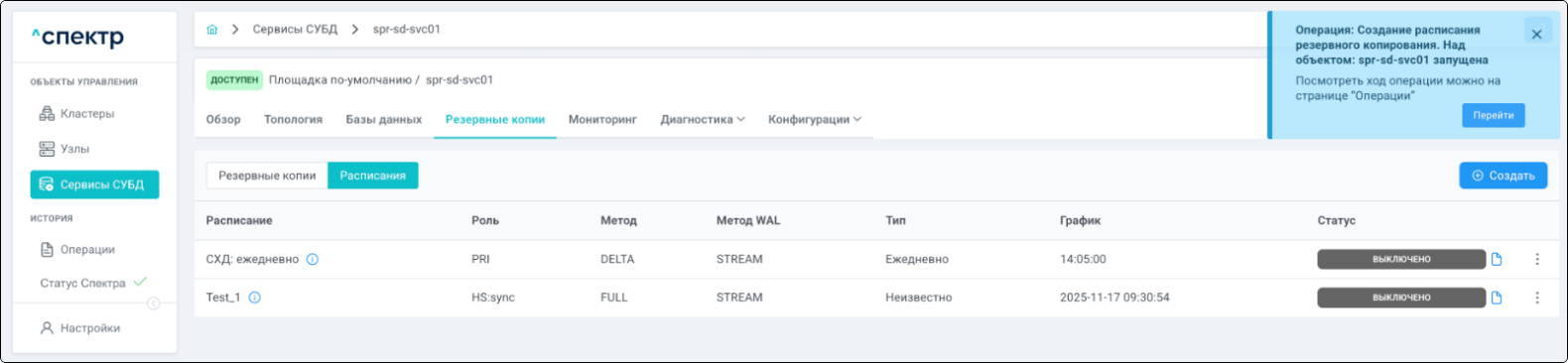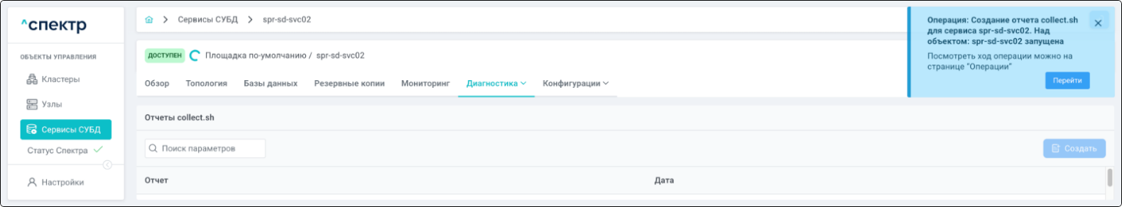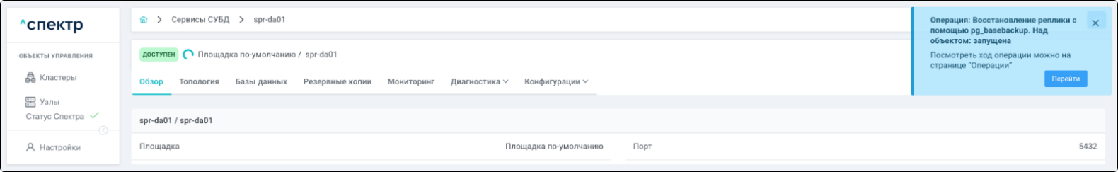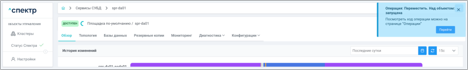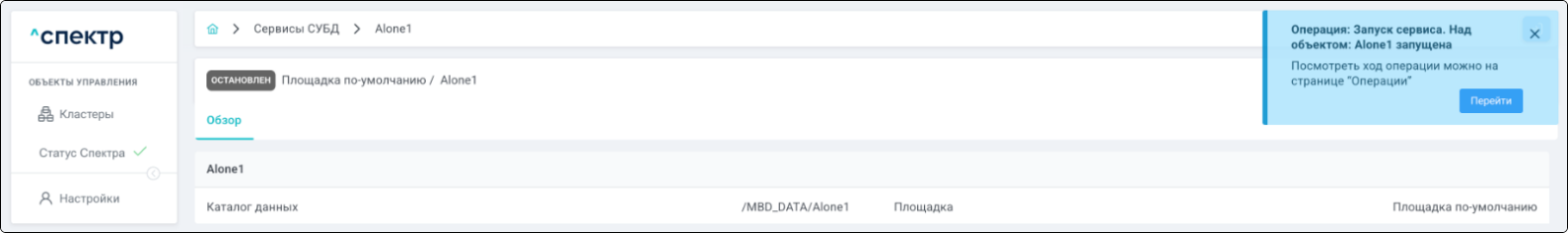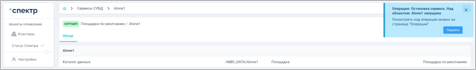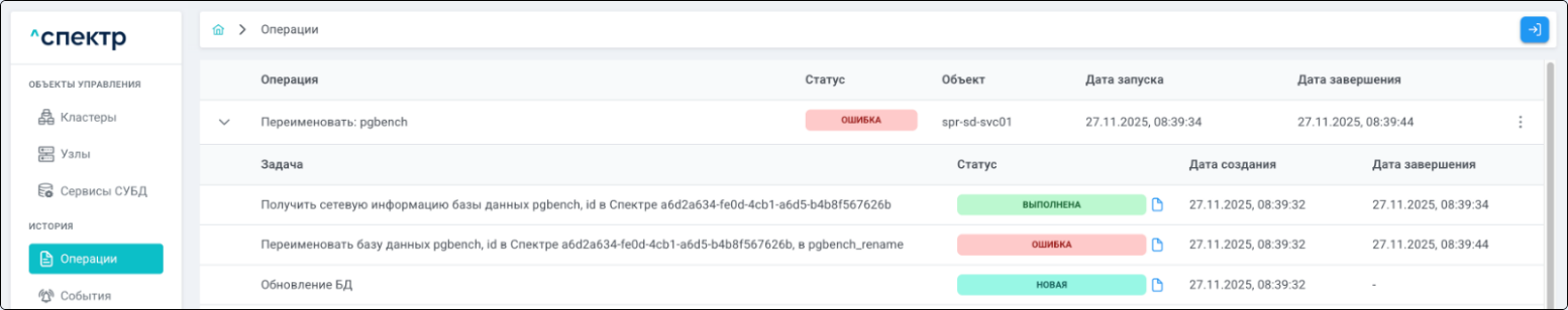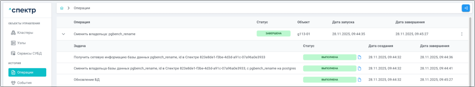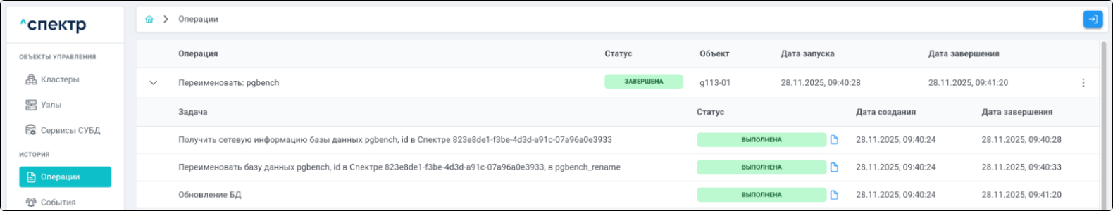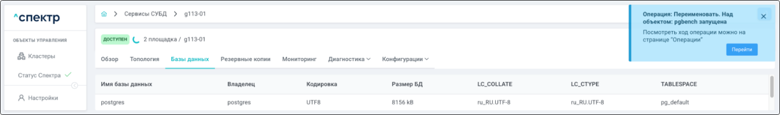 По нажатию кнопки “Перейти” во всплывающем сообщении будет осуществлен переход на страницу “Операции”. Операция переименования БД со статусом “НОВАЯ” и, далее, со статусом “ЗАВЕРШЕНА” появится в верхней строке.