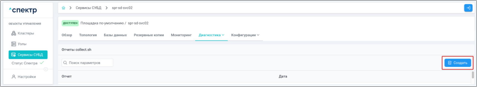 Нажать на имя сервиса для перехода на страницу со вкладками просмотра информации о выбранном сервисе и перейти на вкладку “Базы данных”.