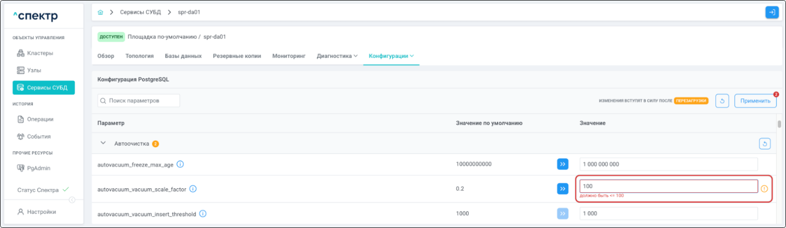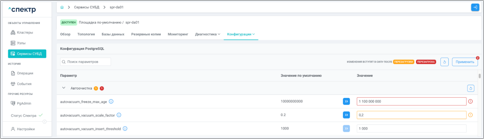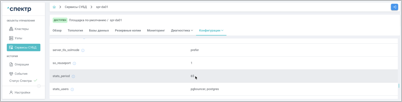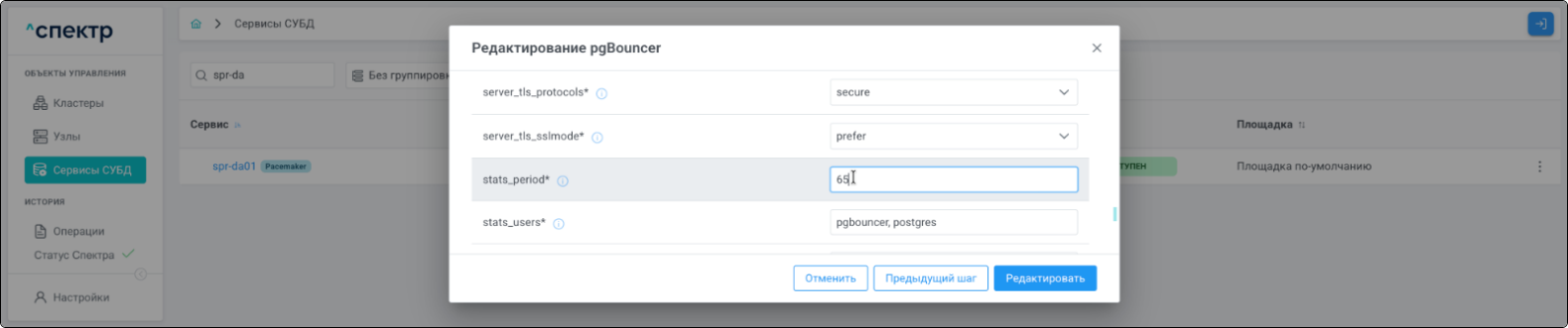 - при переходе к пункту “PgBouncer” вкладки “Конфигурации” для сервиса, в котором был отредактирован pgBouncer, отображаются его параметры в соответствии с внесёнными изменениями: