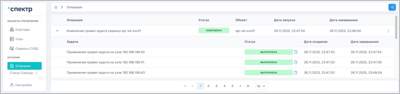 По нажатию кнопки “Перейти” во всплывающем сообщении будет осуществлен переход на страницу “Операции”. Операция изменения правил аудита со статусом “НОВАЯ” и, далее, со статусом “ЗАВЕРШЕНА” появится в верхней строке.