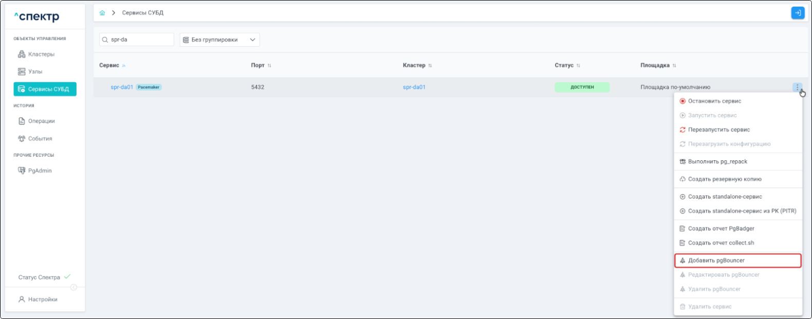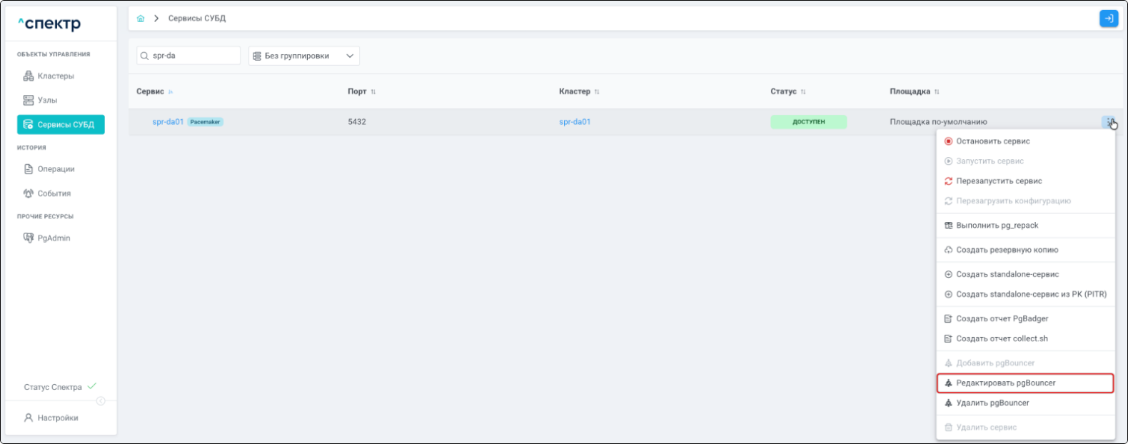 при переходе на страницу “Сервисы СУБД” в меню операций сервиса, в который добавлен pgBouncer, пункт “Добавить pgBouncer” неактивен, пункты “Редактировать pgBouncer” и “Удалить pgBouncer” активны.