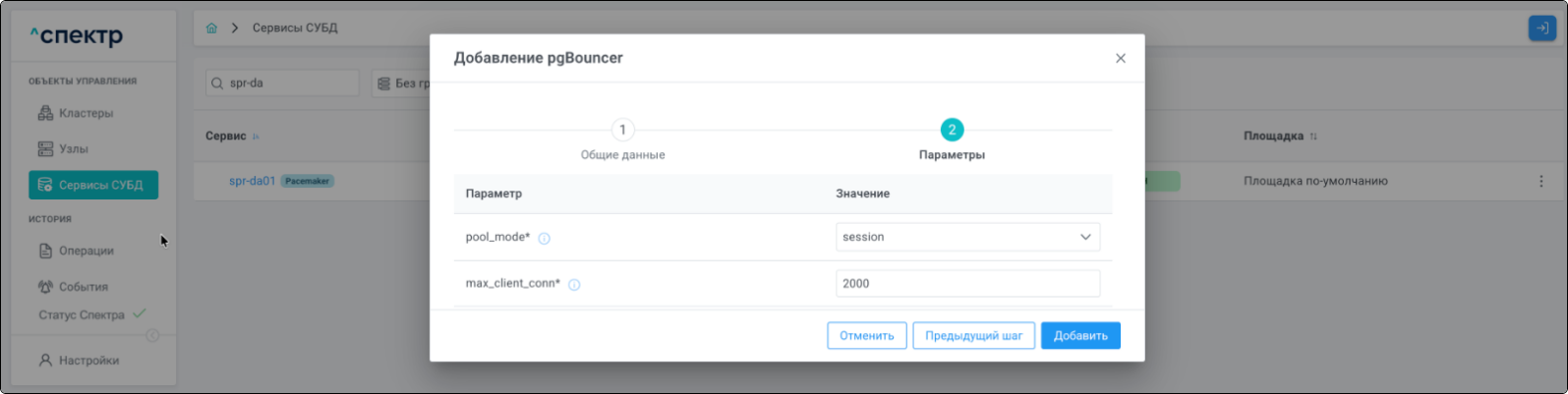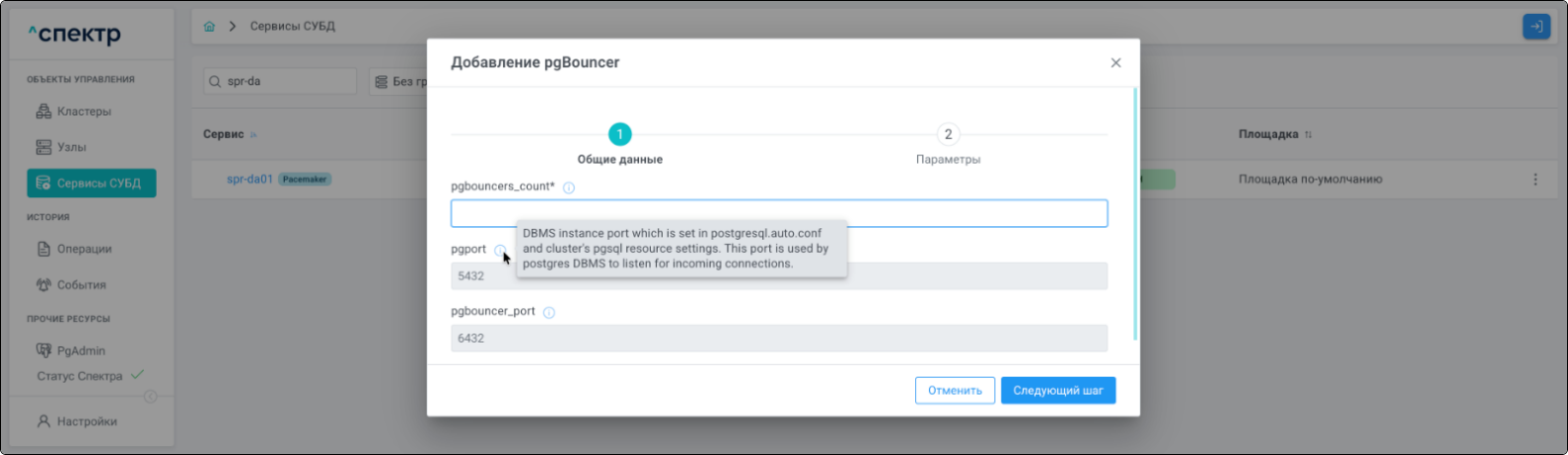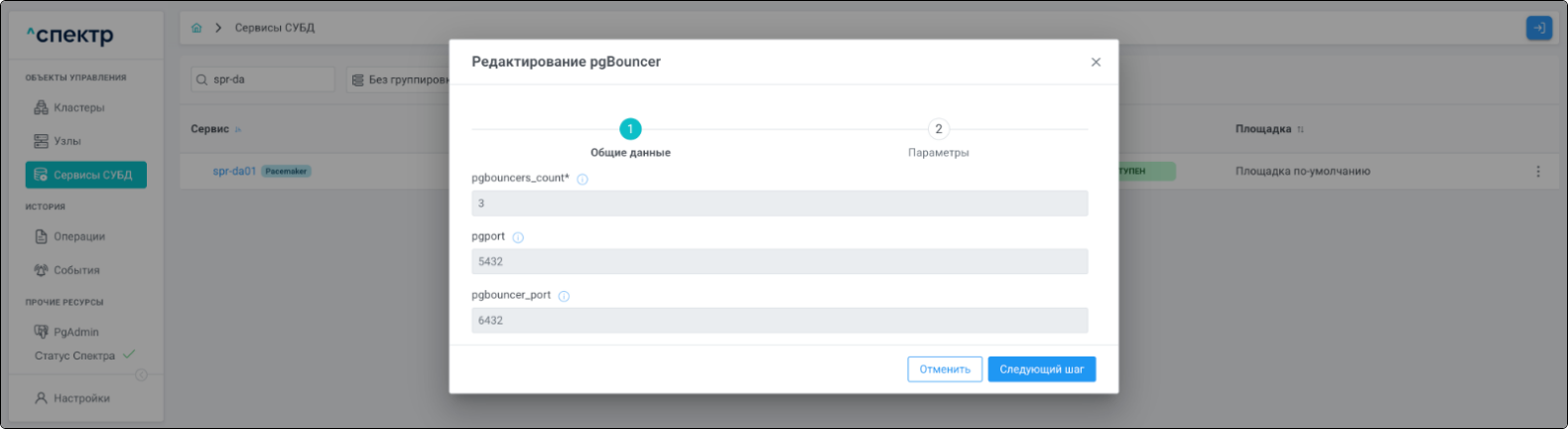 После ввода общих данных pgBouncer нажать кнопку “Следующий шаг”.