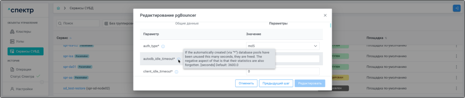 Редактирование pgBouncer возможно для сервисов со статусом “ДОСТУПЕН”.