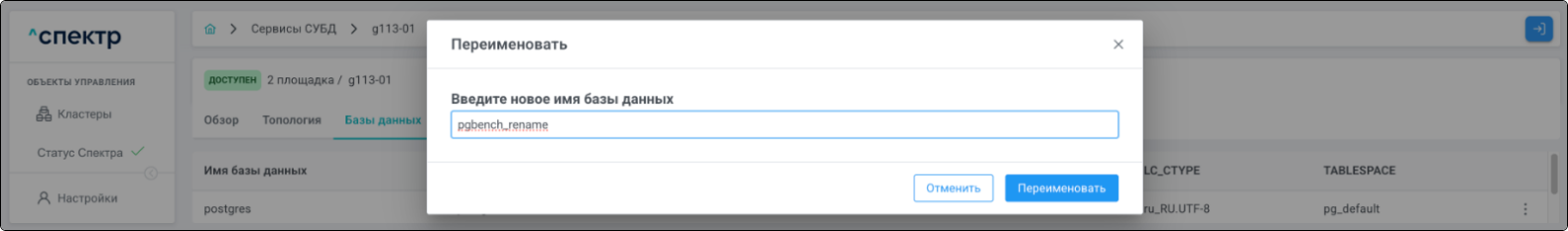 - В окне подтверждения переименования ввести новое имя БД и нажать на кнопку “Переименовать”: