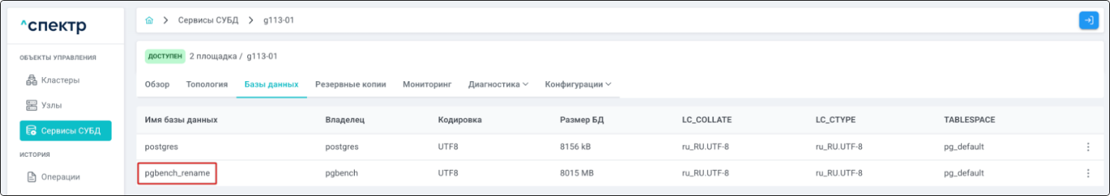 - при переходе на вкладку “Базы данных” имя переименованной базы данных соответствует введённому на шаге 4: