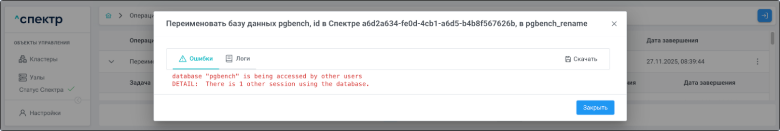 | В случае, если к переименовываемой БД подключены другие пользователи, операция переименования не может быть выполнена (завершится с ошибкой): |