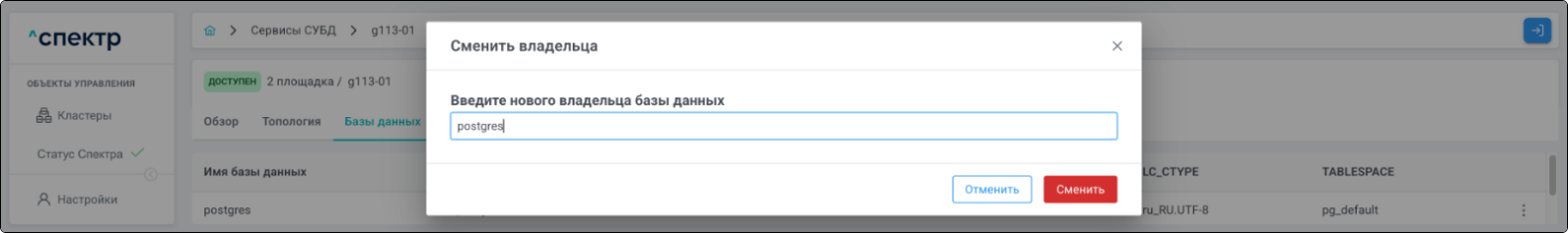 - В окне подтверждения ввести нового владельца БД и нажать на кнопку “Сменить”: