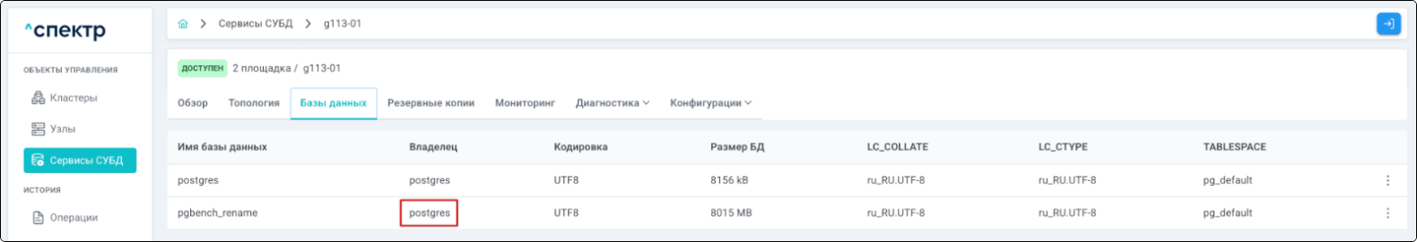 - при переходе на вкладку “Базы данных” отображается имя владельца базы данных, заданное на шаге 4: