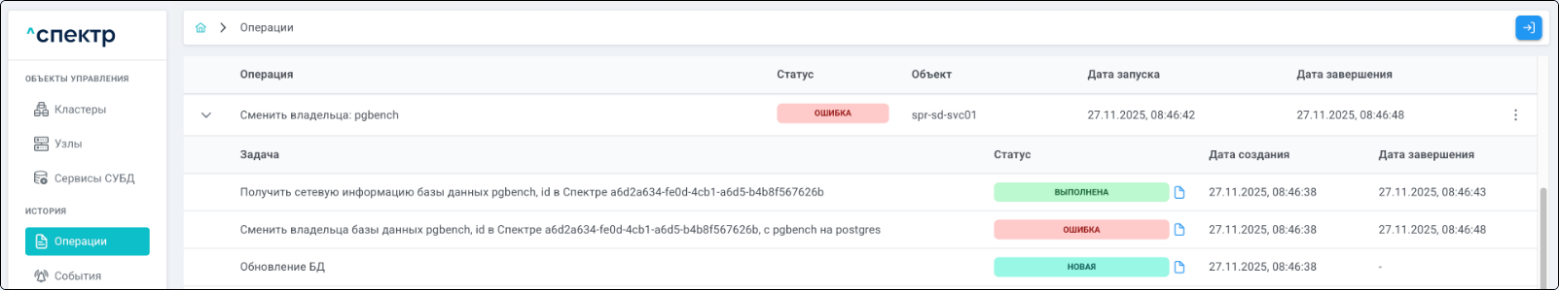 Операция смены владельца БД со статусом “НОВАЯ” и, далее, со статусом “ЗАВЕРШЕНА” появится в верхней строке.