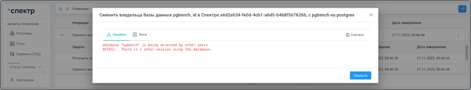 В случае, если к БД, для которой запускается операция смены владельца, подключены другие пользователи, операция смены владельца не может быть выполнена (завершится с ошибкой):